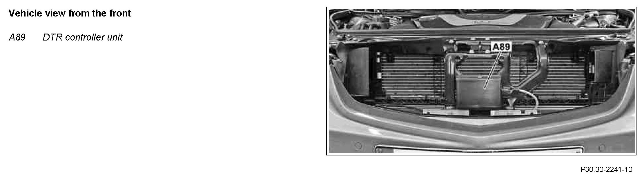 The DTR control unit (A89n1) integrated in the DTR controller unit actuates the DTR radar sensor and evaluates the target data. The DTR controller unit sends the long range radar data over the vehicle dynamics CAN (CAN H) to the radar sensors control unit (for vehicle longitudinal control by the intelligent cruise control Plus Light).