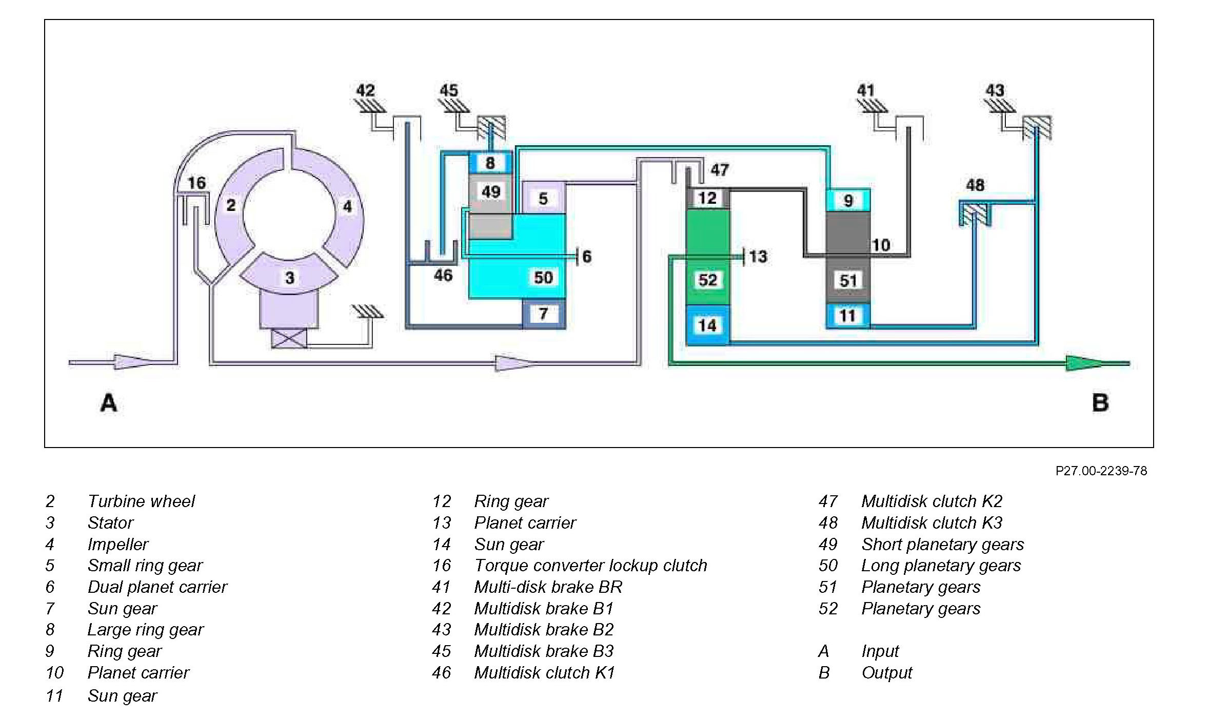 The ring gear (12) has a mechanical connection to the planet carrier (10) and rotates at the same speed. The planetary gears (52) roll on the stalled sun gear (14) and transfer the increased torque and reduced rotational speed to the transmission output shaft via the planet carrier (13). The transmission output shaft thus rotates with reduced transmission input speed in the direction of rotation of the engine.