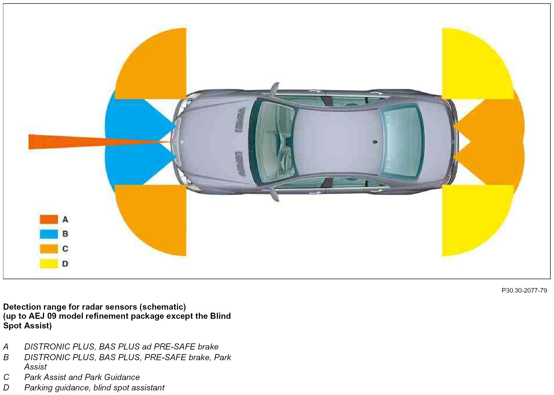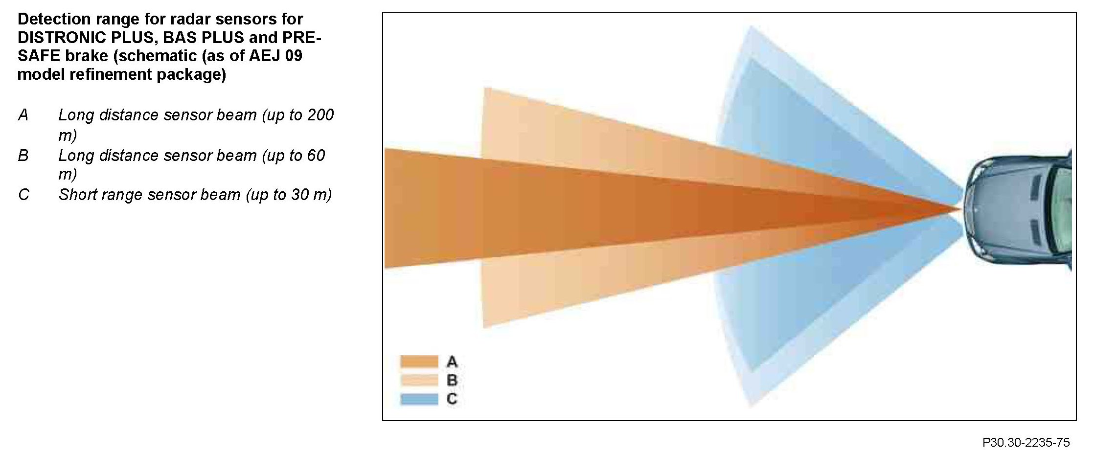 Short range sensors cover a wide area in front of the vehicle. They are particularly suitable, therefore, for low vehicle speed in DISTRONIC PLUS mode.