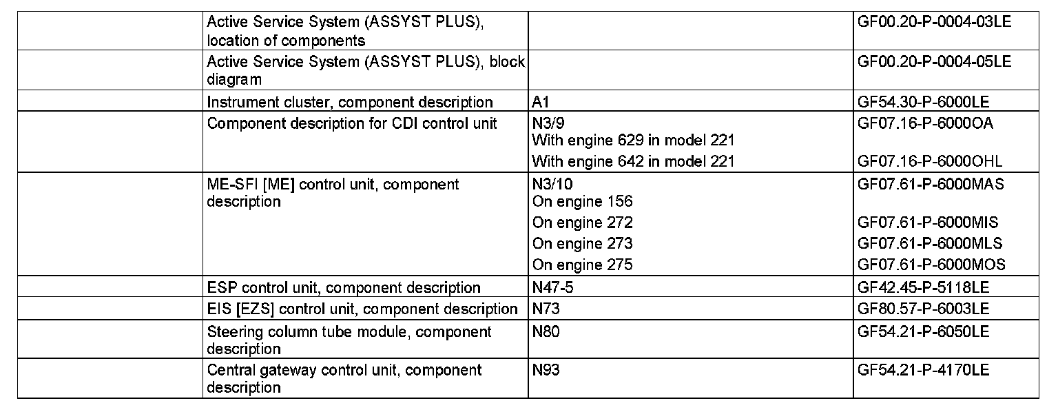 The actual driving conditions are sent by the CDI control unit (N3/9) (with diesel engine) or by the ME-SFI [ME] control unit (N3/10) (with gasoline engine) over the chassis CAN to the central gateway control unit. The relevant data are then evaluated in the internal maintenance computer.