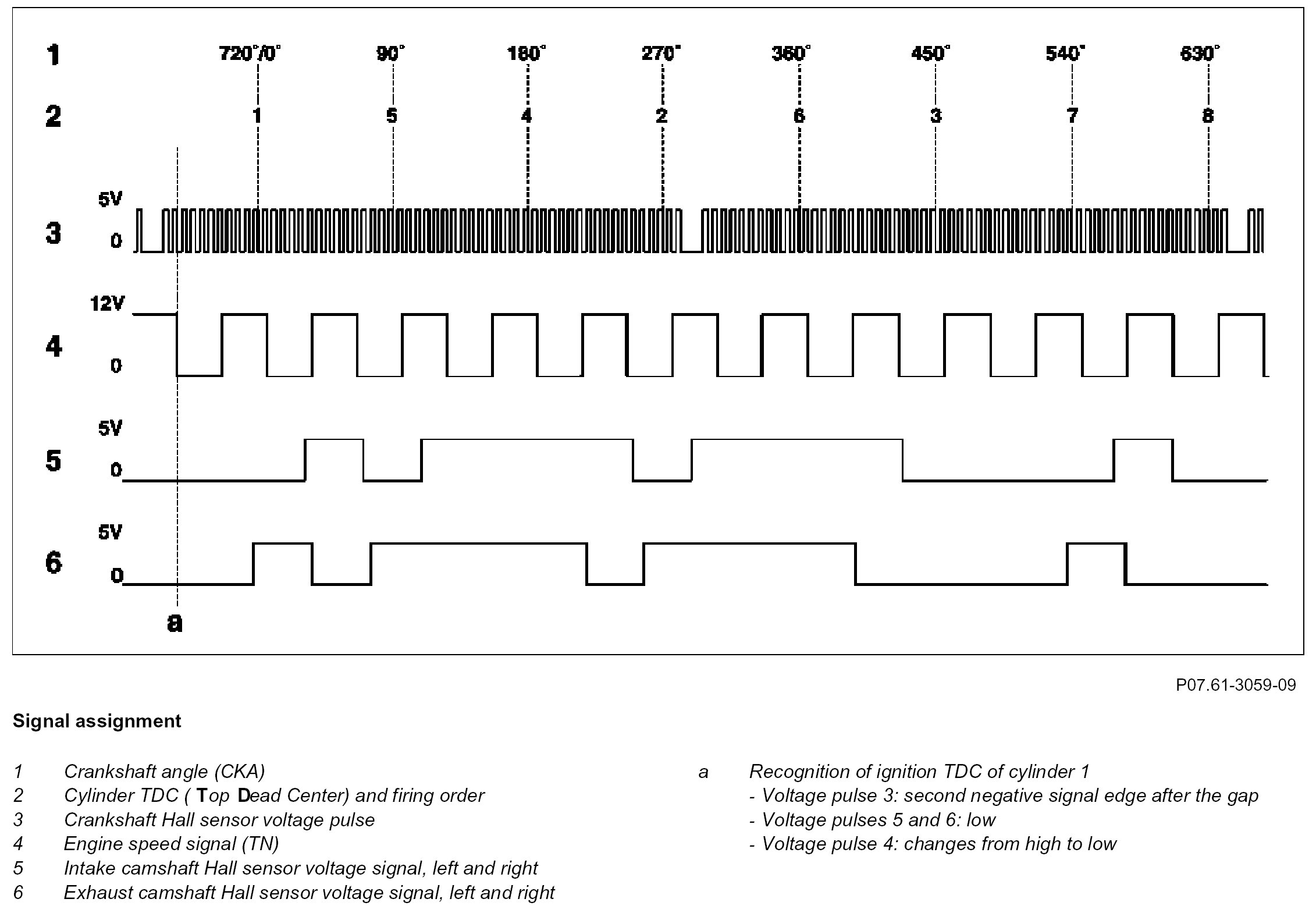 If the voltage pulse fails from the crankshaft Hall sensor, voltage pulses from the intake camshaft Hall sensors, on the left and right (B6/4, B6/5) are used instead (for limp-home mode) or used by the exhaust camshaft Hall sensors, on the left and right (B6/6, B6/7).