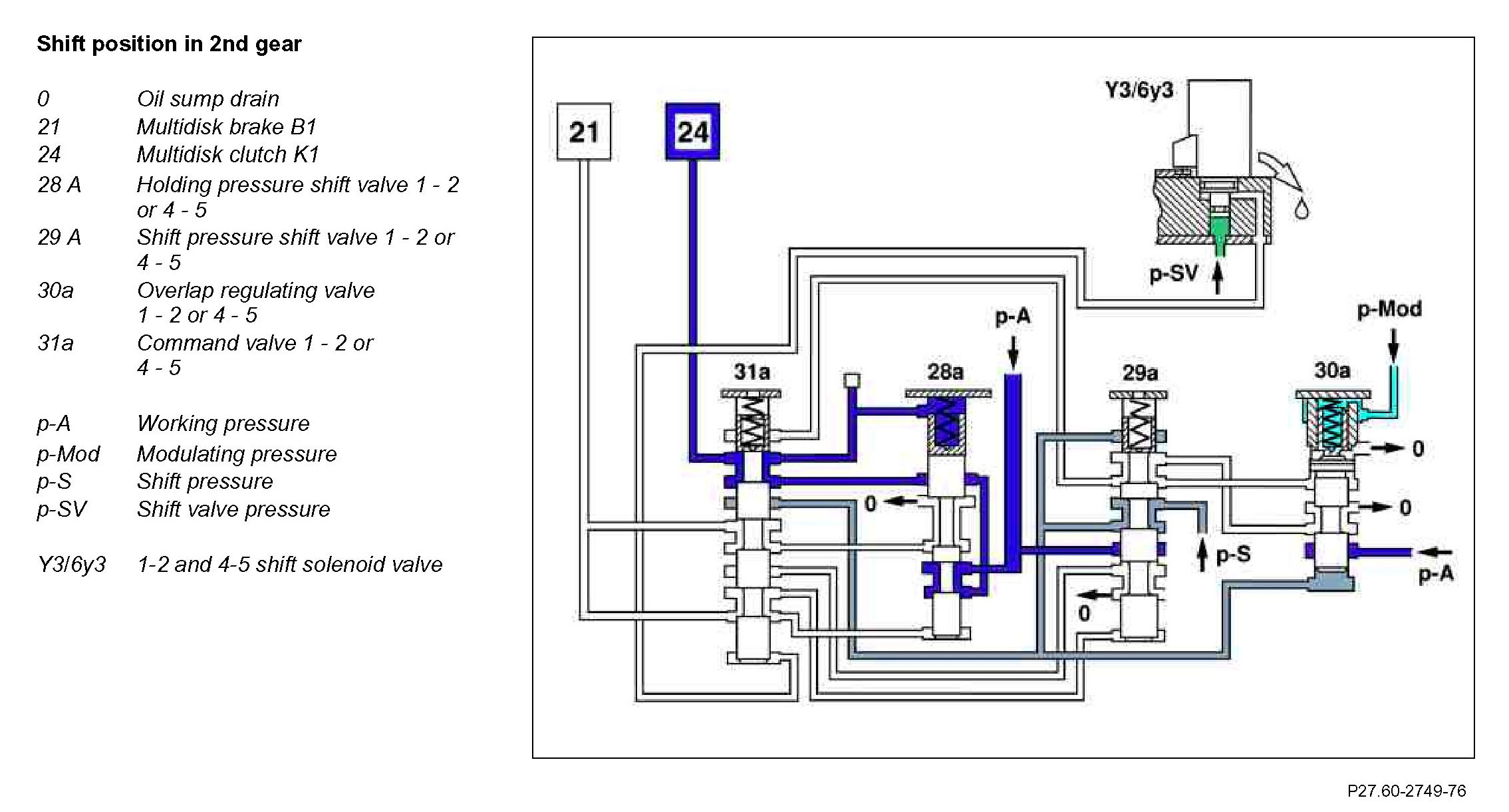 After a successful gear-shift operation, the pressure at the end face of the command valve 1 - 2 or 4 - 5 (31a) is reduced via the shift solenoid valve 1-2 and 4-5 and the command valve is moved to its basic position. The working pressure (p-A) is routed via holding pressure shift valve 1 - 2 or 4 - 5 (28a) and command valve 1 - 2 or 4 - 5 (31a) to the multidisk clutch K1 (24).