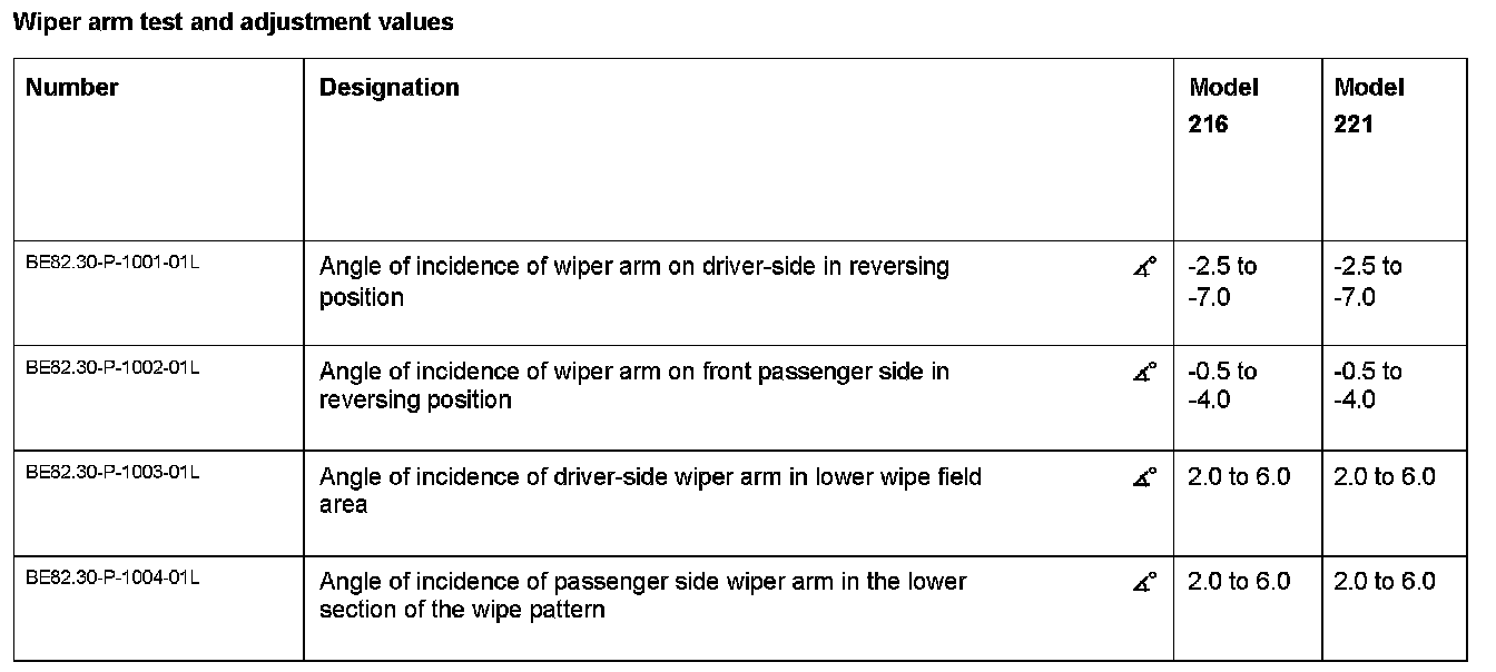 Wiper Arm Test And Adjustment Values: