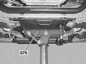 2 Attach transmission platform (070) and transmission jack to the front axle carrier and support.