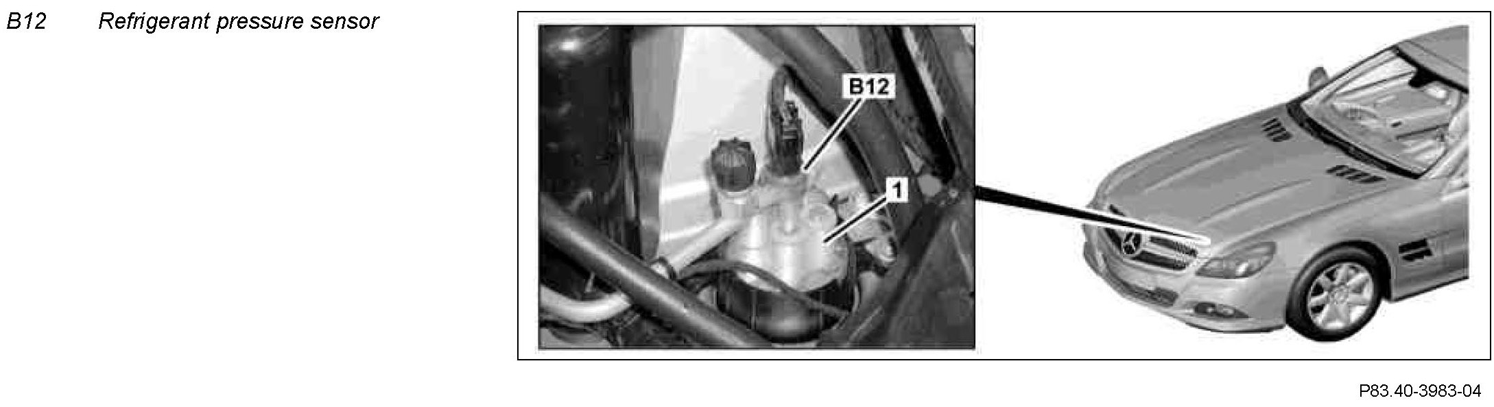 The refrigerant pressure sensor registers the refrigerant pressure. The value is read in by the driver-side SAM control unit (N10/10) and transmitted to the AAC [KLA] control and operating unit (N22) via the interior CAN.The refrigerant pressure sensor operates in a pressure value range of p = 0 to 35 bar.