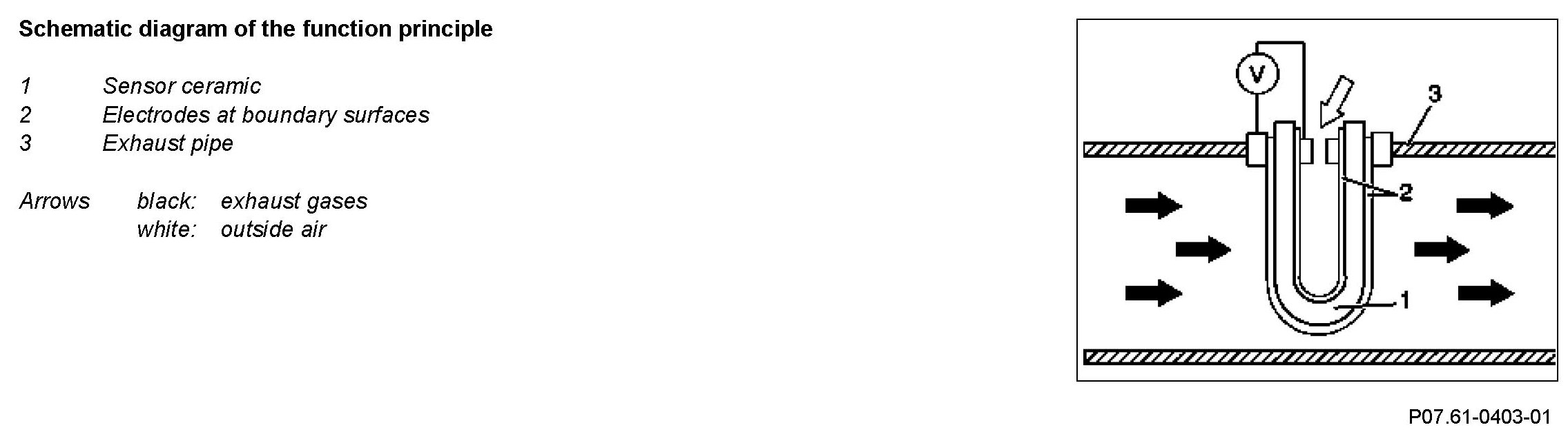 The sensor ceramic is conductive for oxygen ions from approx. 300 °C. If the oxygen concentration on both sides of the sensor ceramic differs, a signal voltage is produced at boundary surfaces as a result of particular properties of the sensor ceramic (Nernst voltage). This is the measure for the residual oxygen content in the exhaust.