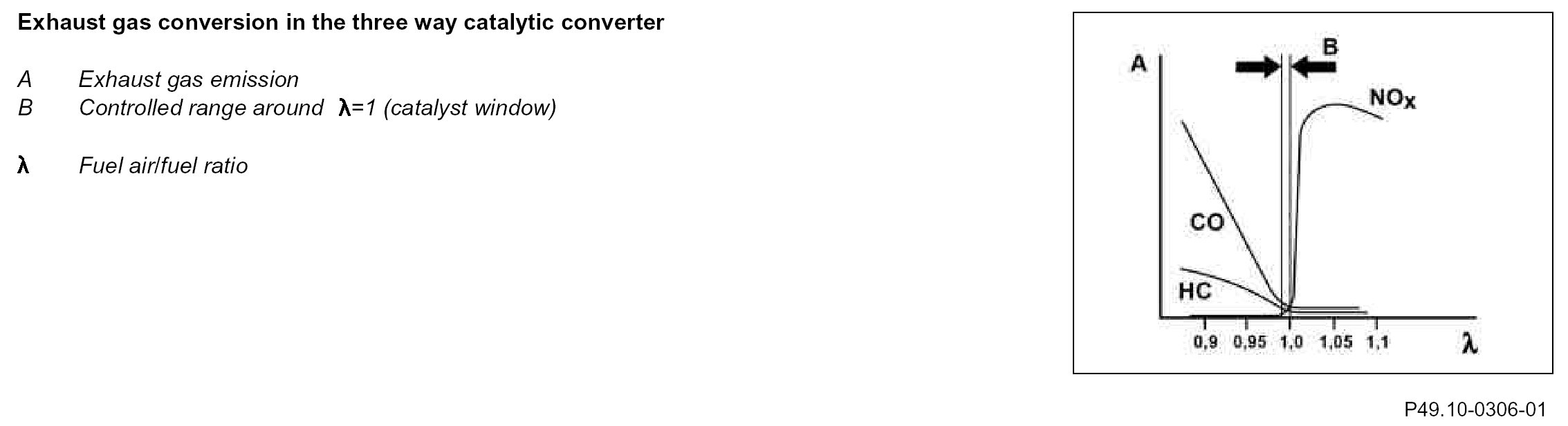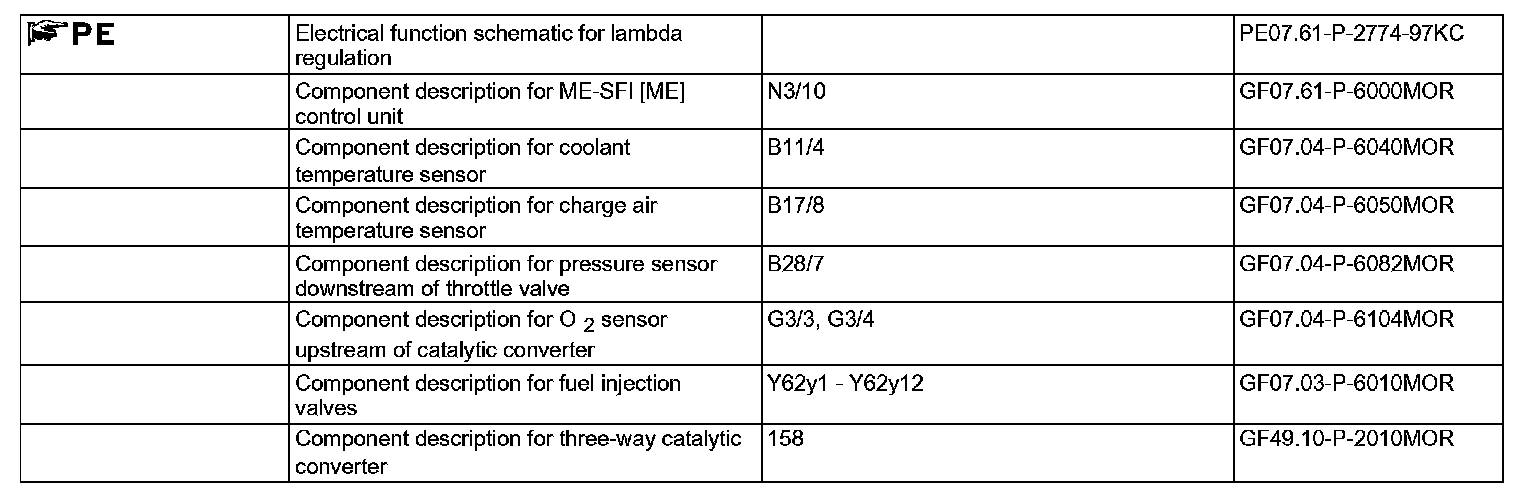 The mixture composition is controlled within the narrowest limits around lambda= 1 in order to achieve high conversion of the exhaust gases (exhaust gas conversion) in the catalytic converters. For this purpose, the ME-SFI [ME] control unit (N3/10) reads the following sensors: