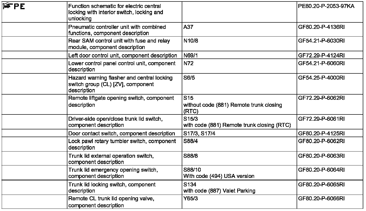 - Remote trunk opening switch (S15) without code (881) Remote trunk closing (RTC))