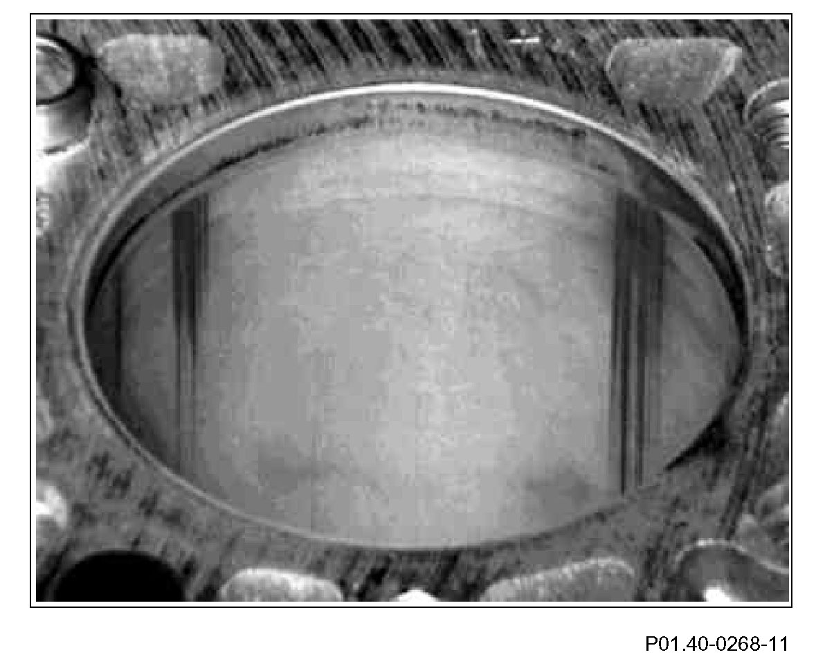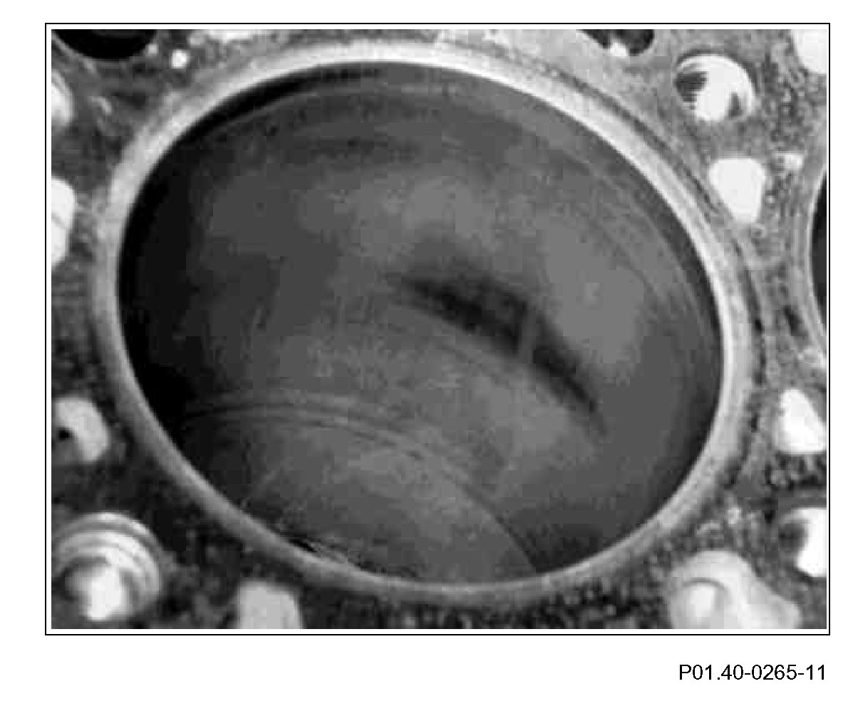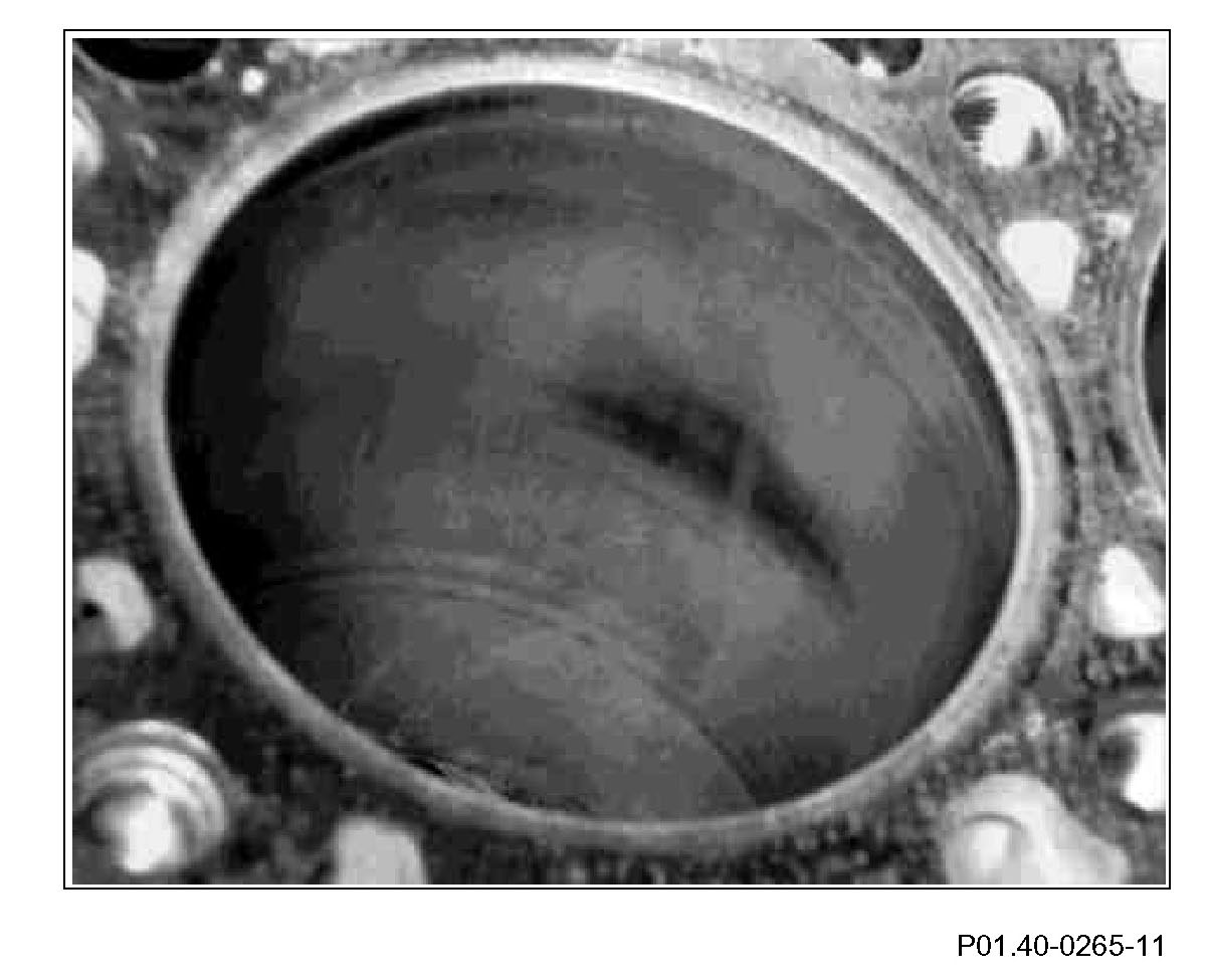 Starting from first piston ring, tapering to an end after about 30 mm. Traces of dry friction marks which cannot be felt, caused by oil film being washed off by fuel, e.g. during frequent cold starts associated with short-distance driving. These traces of friction marks which occur principally in area of cylinder head bolts and on pressure side are not a problem provided they are smoothed. The piston rings are not damaged. Reuse crankcase.