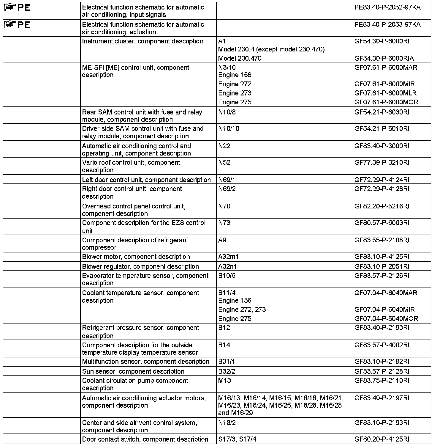 The open and closed status of the respective doors is registered by the left door contact switch (S17/3) and the right door contact switch (S17/4). The door status is read in by the rear SAM control unit (N10/8) and transmitted to the control and operating unit. The control and operating unit retains the current blower output when the door is open in order to prevent unnecessary readjustment in the event of high temperature differences between the inside and outside air.