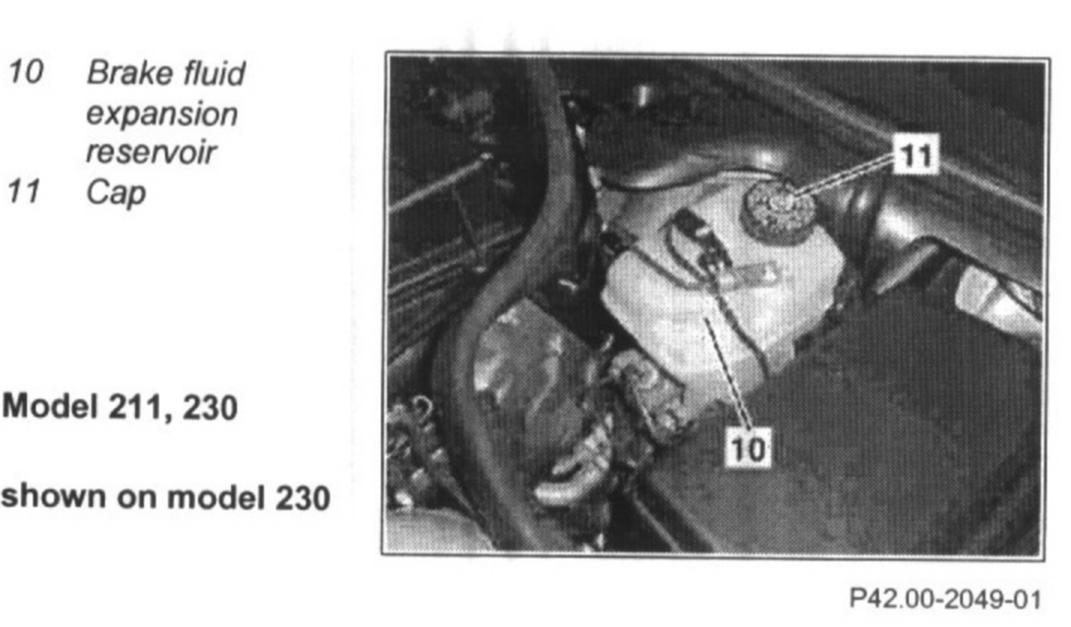 - The fluid level must be between the "MAX." and "MIN." marks embossed in the brake fluid expansion reservoir (10).