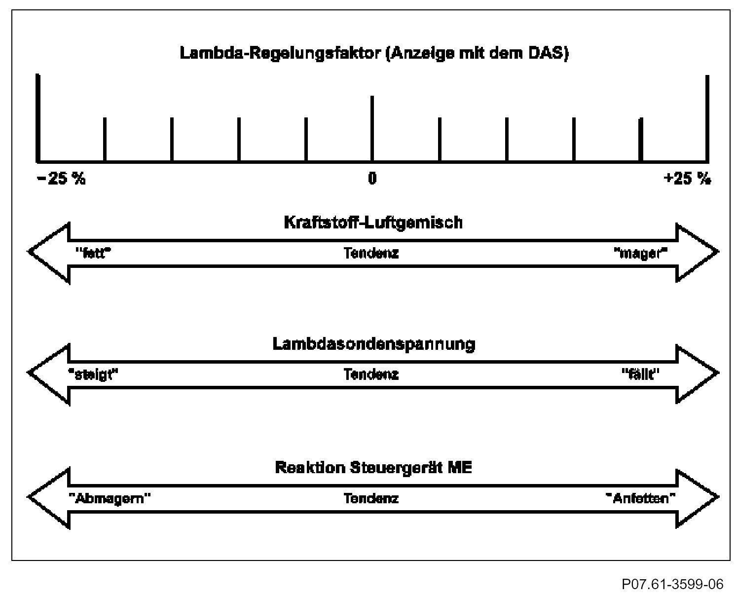 The more the lambda control factor moves in the direction +25%, the leaner is the fuel-air mixture and the greater is the enrichment of the mixture on the part of the ME control unit.