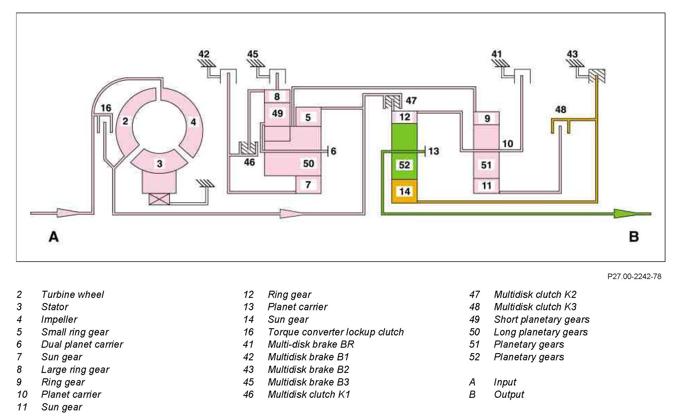 The speeds of the ring gears (9, 12) are the same due to the engaged multidisk clutch K2 (47). As a result the rear single planetary gear system is locked and not actively involved in the gear ratio.