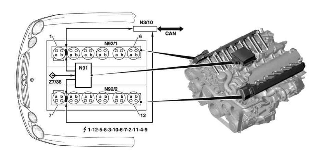 There is an output stage for each spark plug in the ignition modules. The ignition coils are arranged in the spark plug connectors. The output stages with oscillating circuit generate the ignition voltage from an input of about 180 V.