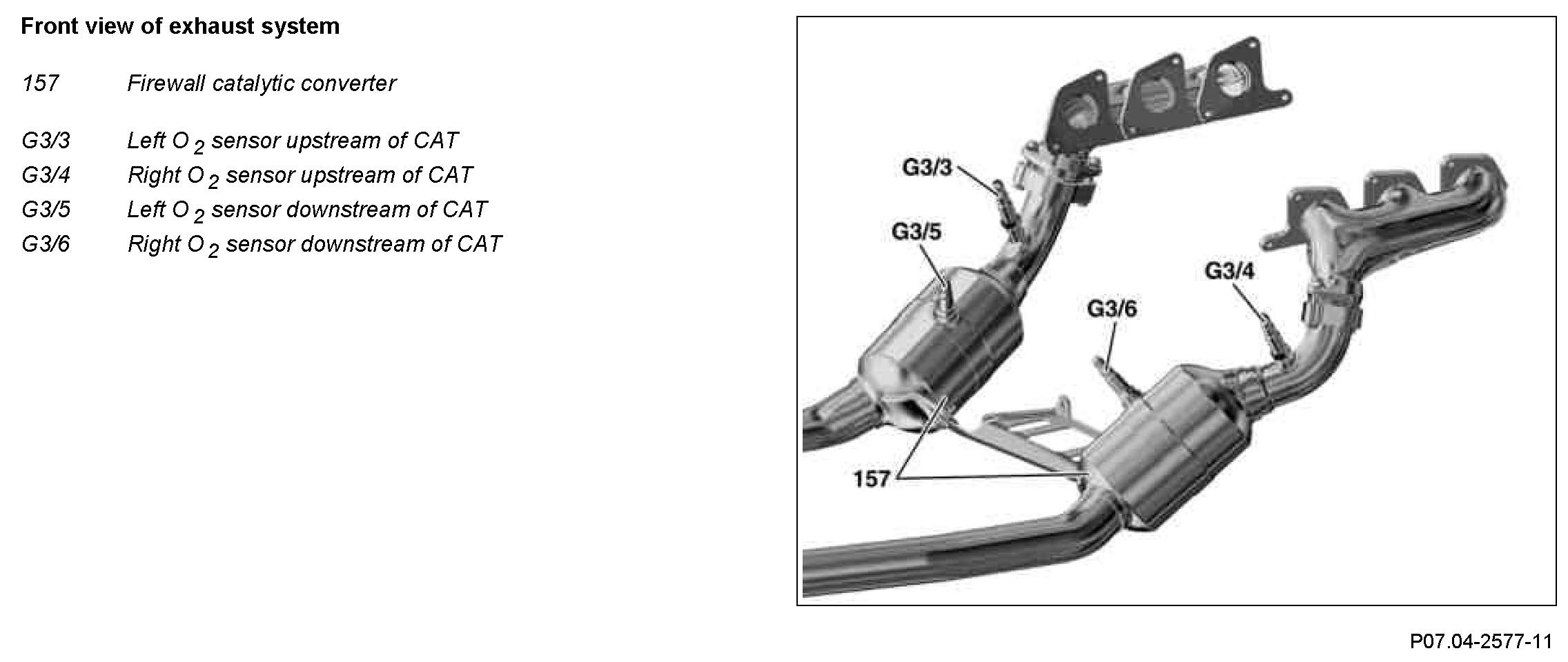 The O2 sensors downstream of CAT are screwed in the side of the firewall catalytic converter. They project into the hollow spaces between both catalytic inserts for the firewall catalytic converters.