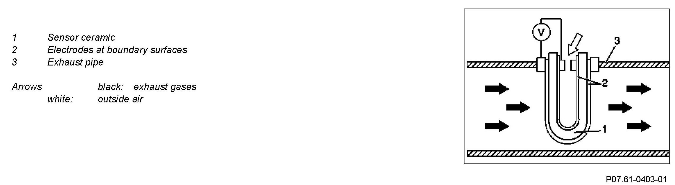The sensor ceramic is conductive for oxygen ions from approx. 300 °C. If the oxygen concentration on both sides of the sensor ceramic differs, a signal voltage is produced at boundary surfaces as a result of particular properties of the sensor ceramic (Nernst voltage). This is the measure for the residual oxygen content in the exhaust.