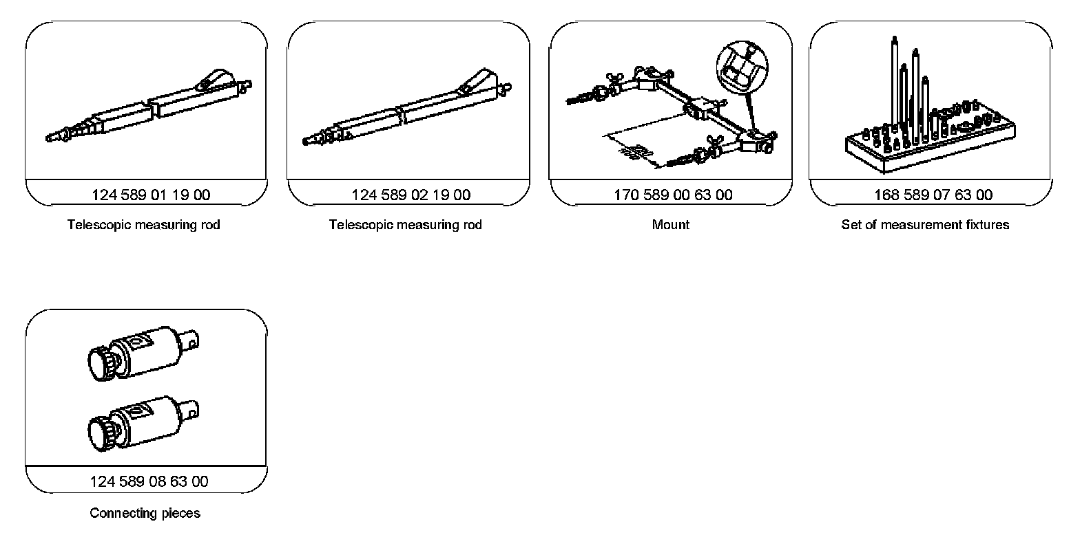 The measuring set is designed in such a way, that the measuring bolts, according to the measuring points at the vehicle, can be screwed together out of mounting bolts, extensions and measuring tips/bolts.