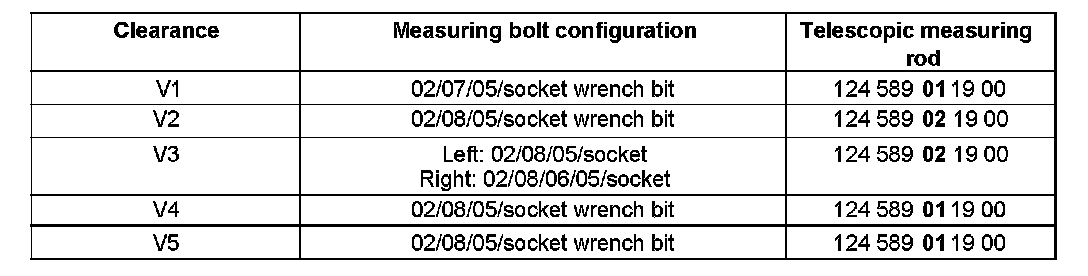 The configuration of the measuring bolts is shown in the table, where the digits in the column headed "Measuring bolt configuration" are the special tool end numbers.