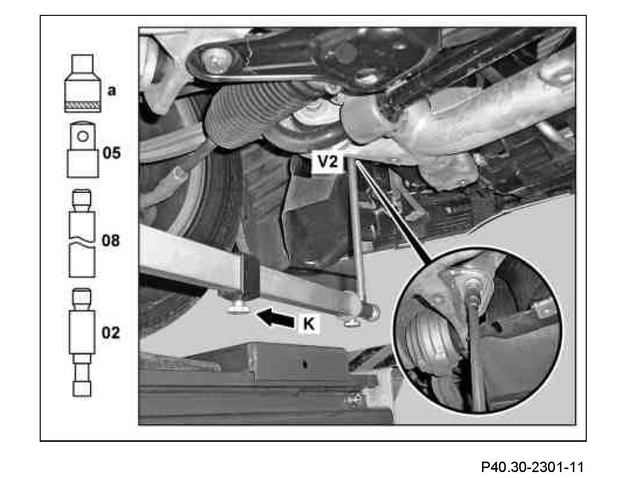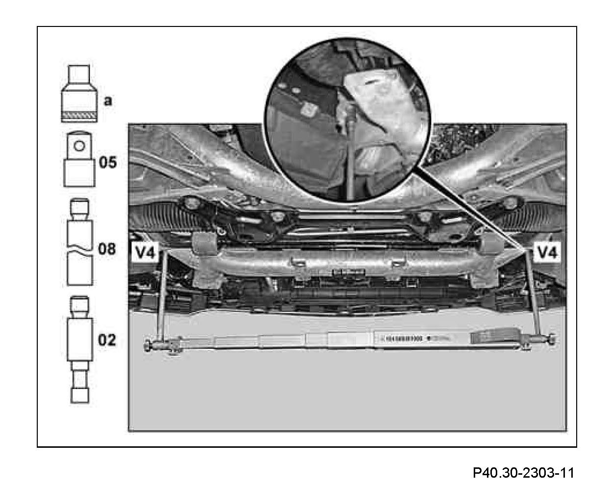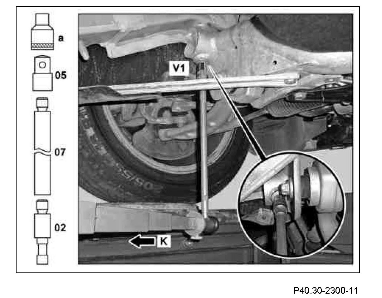 1 Measure distance dimension (V1) from check point (K) to center of Torx bolt head of rear mount of front axle carrier. Measure on the left and right side in each case.