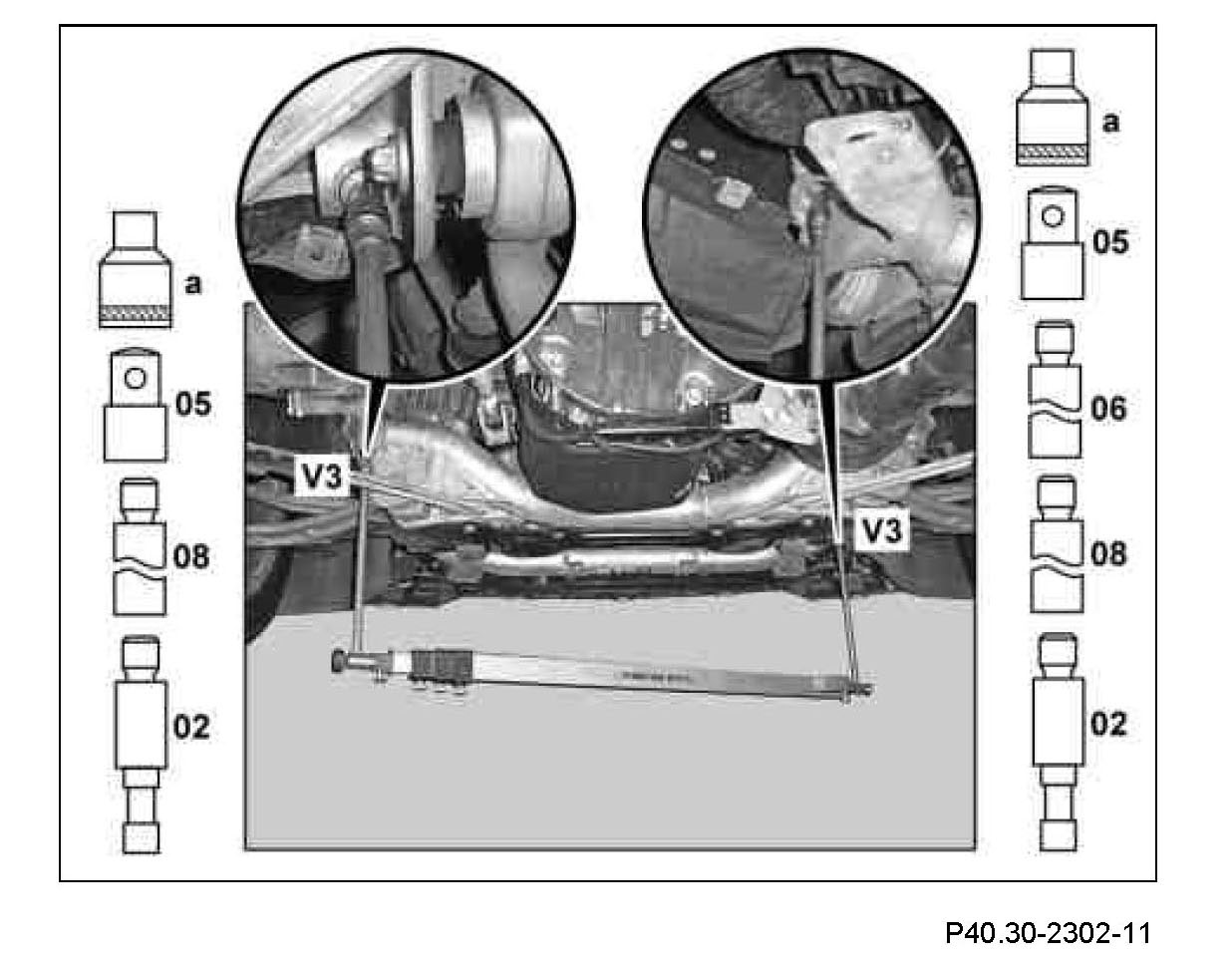 3 Measure distance dimensions (V3) diagonally between the centering point of the Torx bolt heads of the front and rear mount of the front axle carrier.