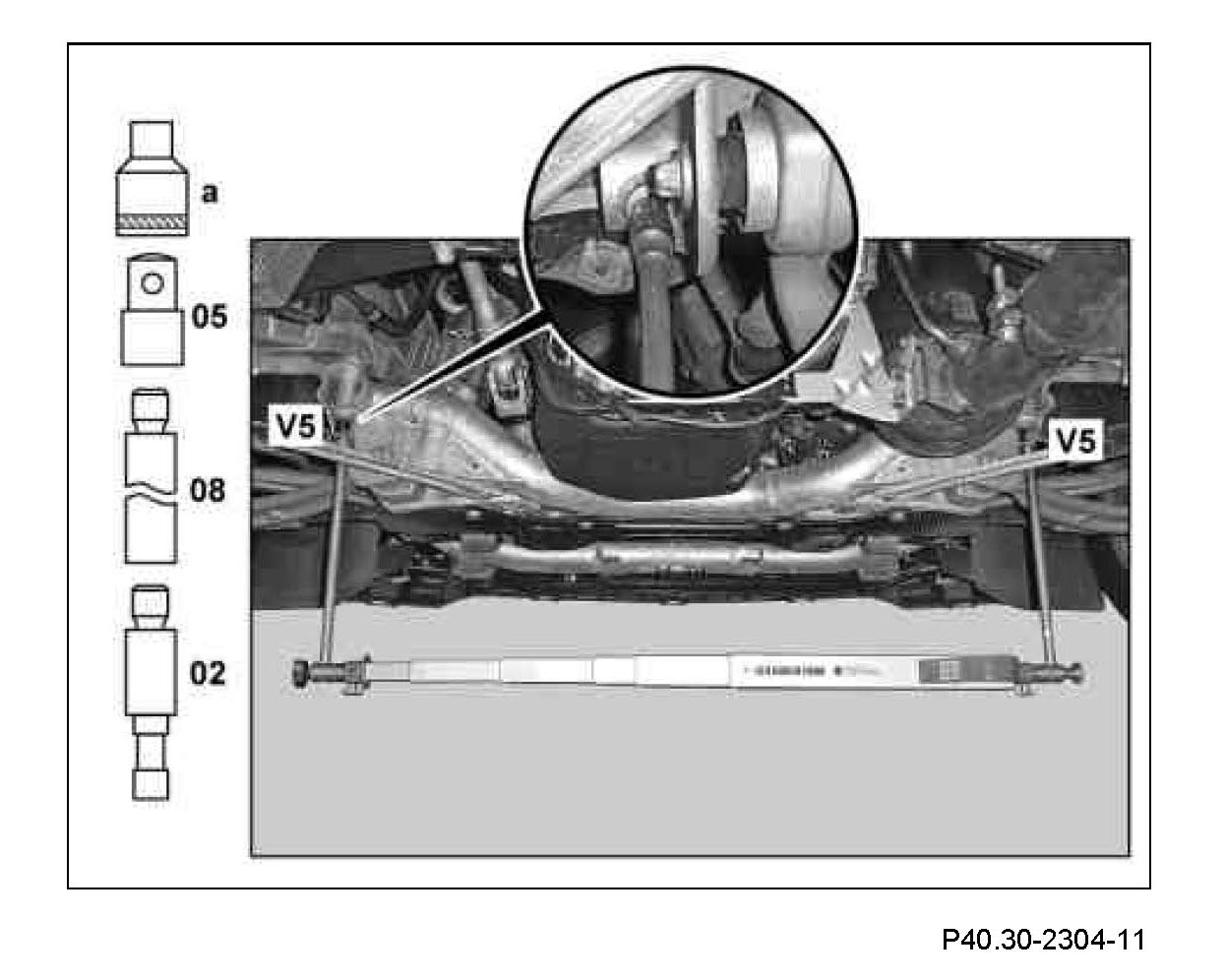 5 Measure distance dimension (V5) from the centering point of the Torx bolt heads between the rear bearings of the front axle carrier.