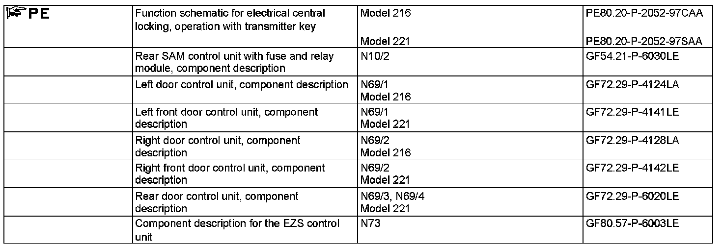 When the "Lock or unlock" button the transmitter key is actuated, it transmits a radio signal via the rear window antenna amplifier module (A2/12) to the rear SAM control unit with fuse and relay module (N10/2). The EIS control unit (N73) receives the signal from the SAM control unit via the interior CAN. Parallel to the radio signal, an infrared signal is transmitted driver door infrared sensor (B58) (precise aiming required). This signal is read in by the left door control unit (N69/1) (on model 216) or left front door control unit (N69/1) (on model 221) and transmitted to the EIS control unit via the interior CAN.