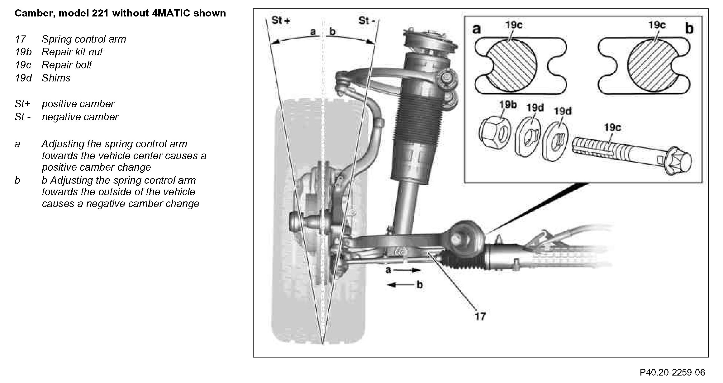 4 To adjust the camber and power-down, replace each standard bolt connection (A) to the torque strut (18) or spring control arm (17) with a repair bolt repair bolt (B).