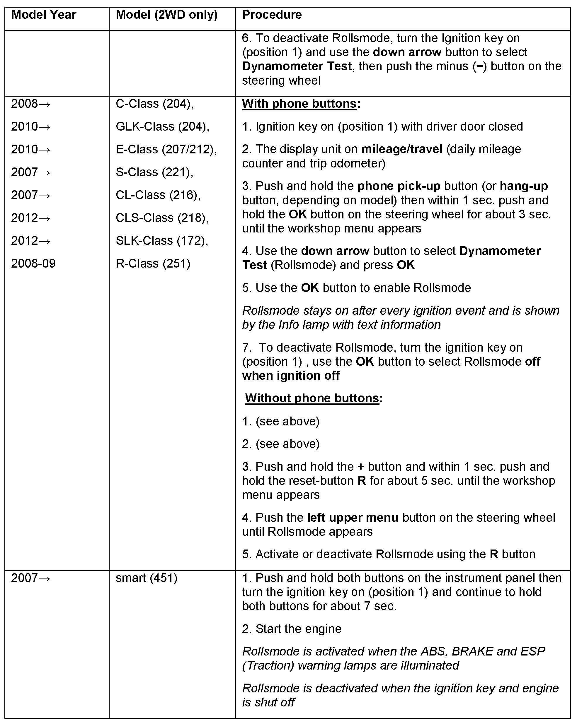 ^ Mercedes-Benz vehicles that are 2WD and do not have "Dyno-Mode" capability