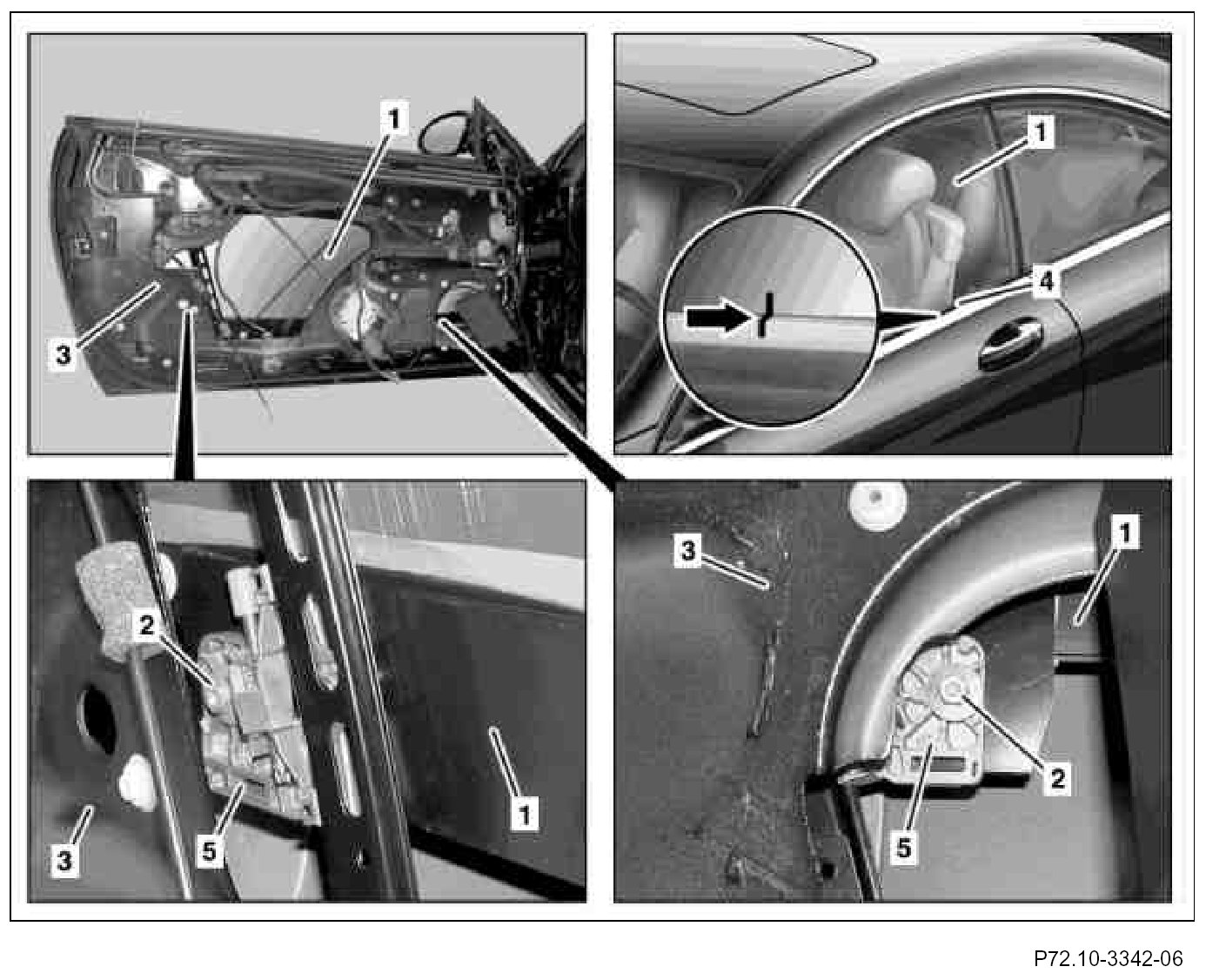 6. Raise crank window (1) in rear area and center screw head of bolt (2) between the two stays on the rear driver (5).Finally, first tighten rear, then front bolt (2) with specified tightening torque.