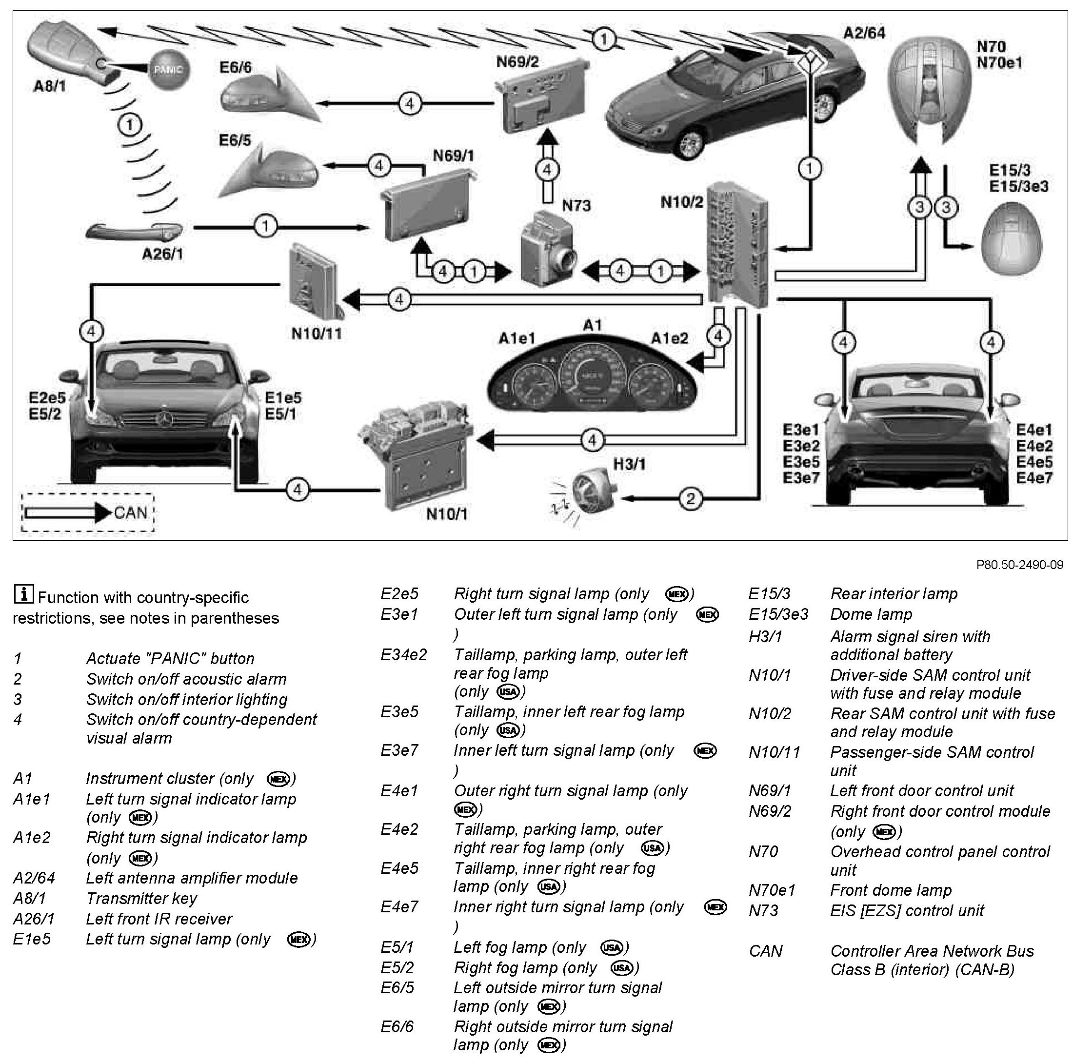 When the "PANIC" on the transmitter key is pressed for approx. 2 s it transmits a radio signal to the left antenna amplifier module. This signal is relayed to the EIS control module via the rear SAM control module Parallel to the radio signal an infrared signal is transmitted to the IR receiver (precise aiming required). This signal is read in by the left front door control module and transmitted via CAN-B bus to the EIS control module which checks the access authorization.