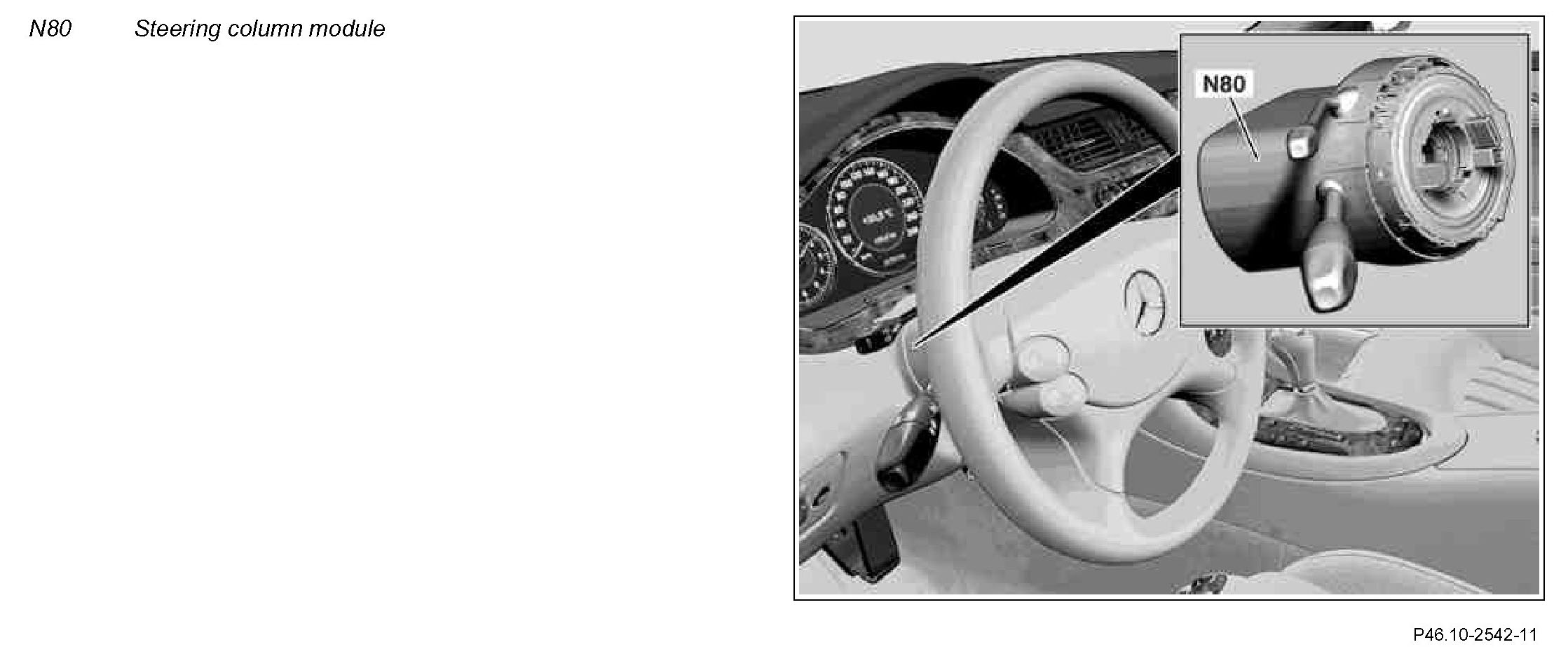 The steering angle sensor (N49) is integrated into the steering column module (N80). The steering column module is located on the steering column behind the steering wheel in the interior compartment.