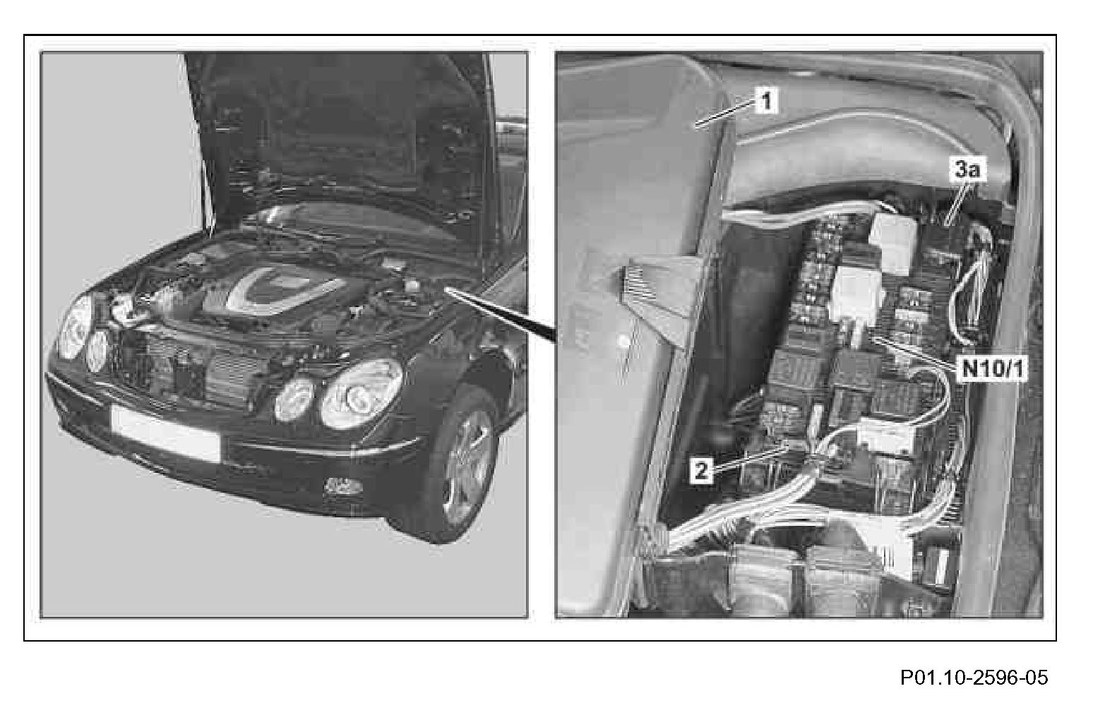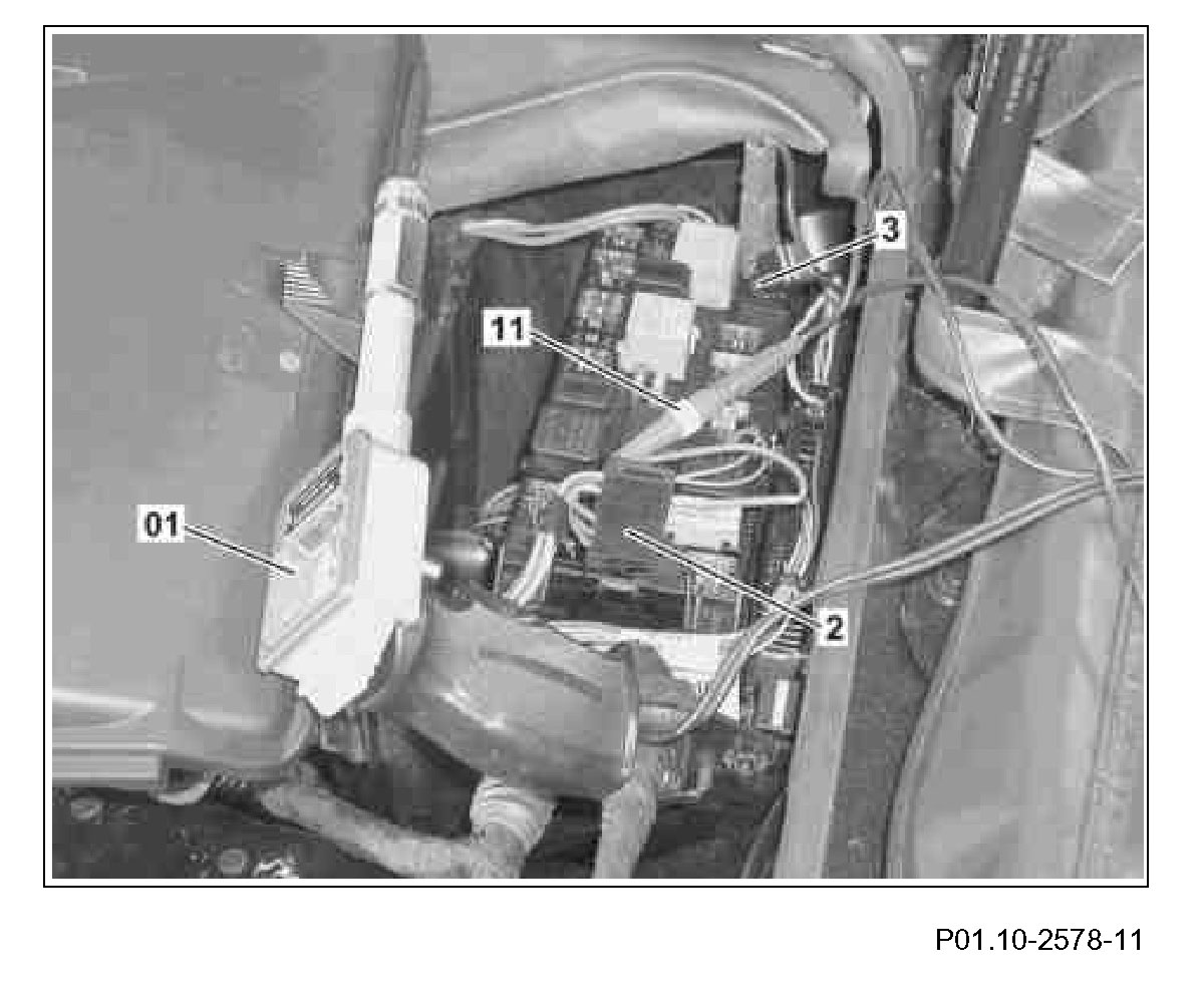 1 Remove cover (1) on left fuse and relay box in the engine compartment.