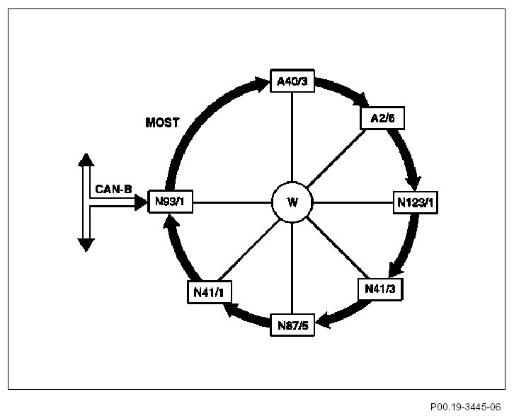 Depending on the equipment, the radio or the audio gateway control unit is the interface (gateway) for data exchange between the MOST and the CAN-B. The central gateway control unit is the interface for data interchange between the CAN-B and the CAN-C. It also represents the interface via CAN-D to the data link connector to enable the control units to be tested using STAR DIAGNOSIS.