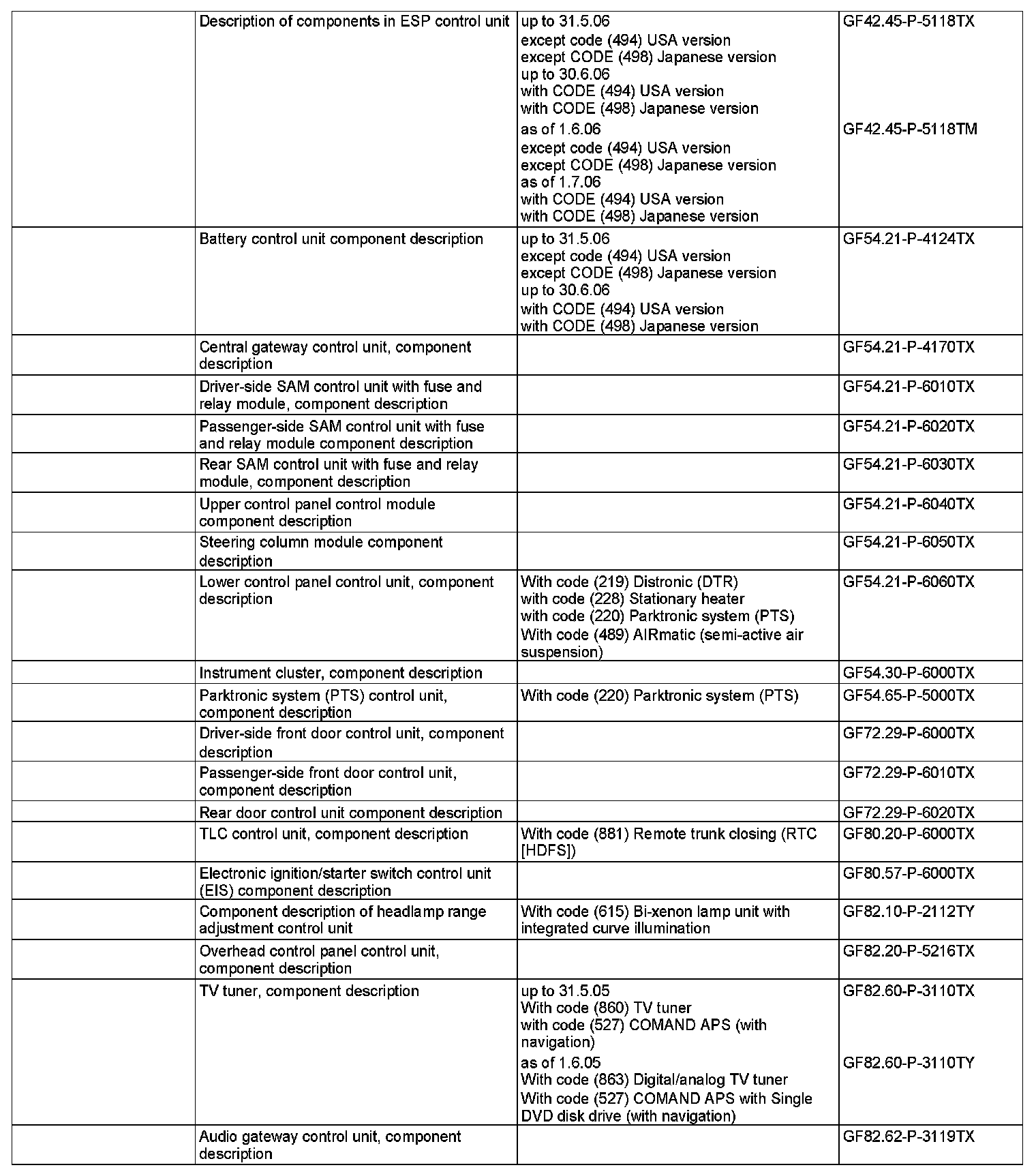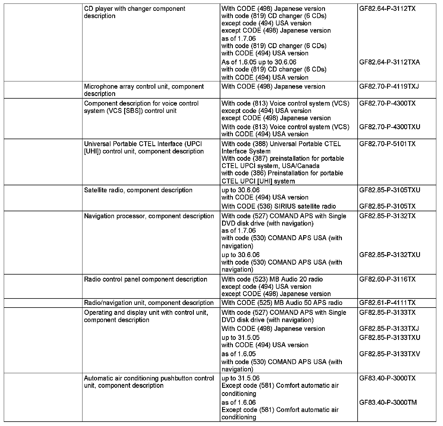 As an alternative to the standard equipment, the following equipment variants are possible for the radio: Radio control panel and navigation unit with code (525) MB Audio 50 APS radio or COMAND operating, display and controller unit with code (527) COMAND APS with single DVD drive (with navigation). With these variants, the audio gateway control unit takes the place of the radio.