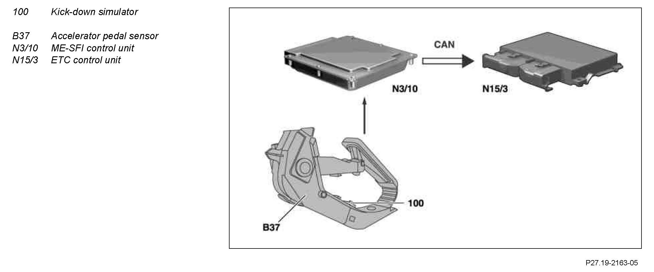 The kickdown signal is recorded by the accelerator pedal sensor (B37), read in by the ME control unit (N3/10) and passed on to the ETC [EGS] control unit (N15/3). Based on this information the ETC control unit (N15/3) actuates the solenoid valves so that the upshifts and downshifts take place at higher engine speeds in order to achieve maximum performance.