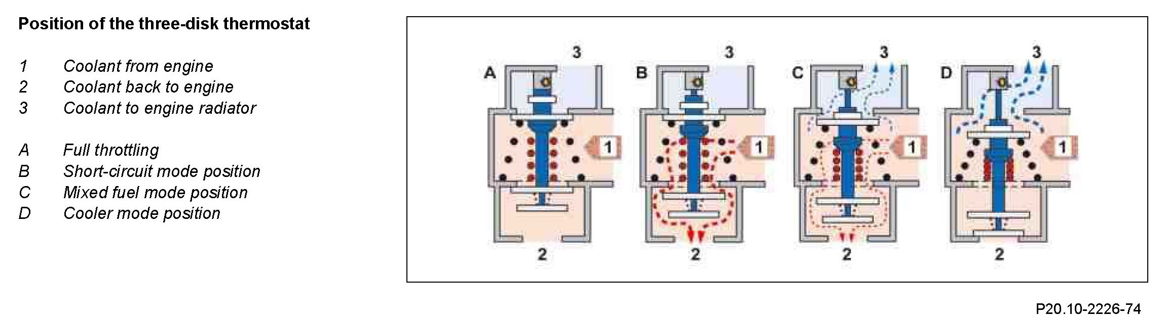 When heated, the three-disk thermostat opens in the coolant thermostat. In this way the coolant temperature of 80 to 100 °C is regulated via the duty cycle.