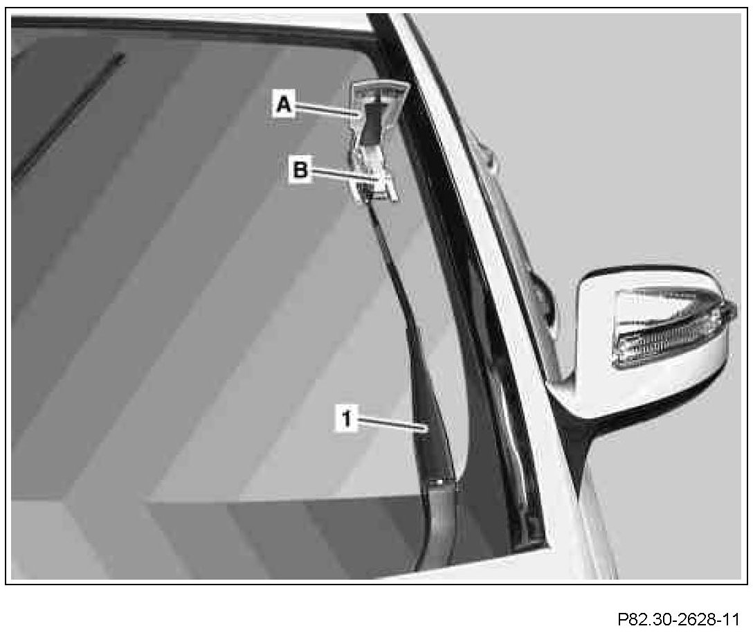 13 Remove angle gauge (A) together with adapter (B) from driver-side wiper arm (1).