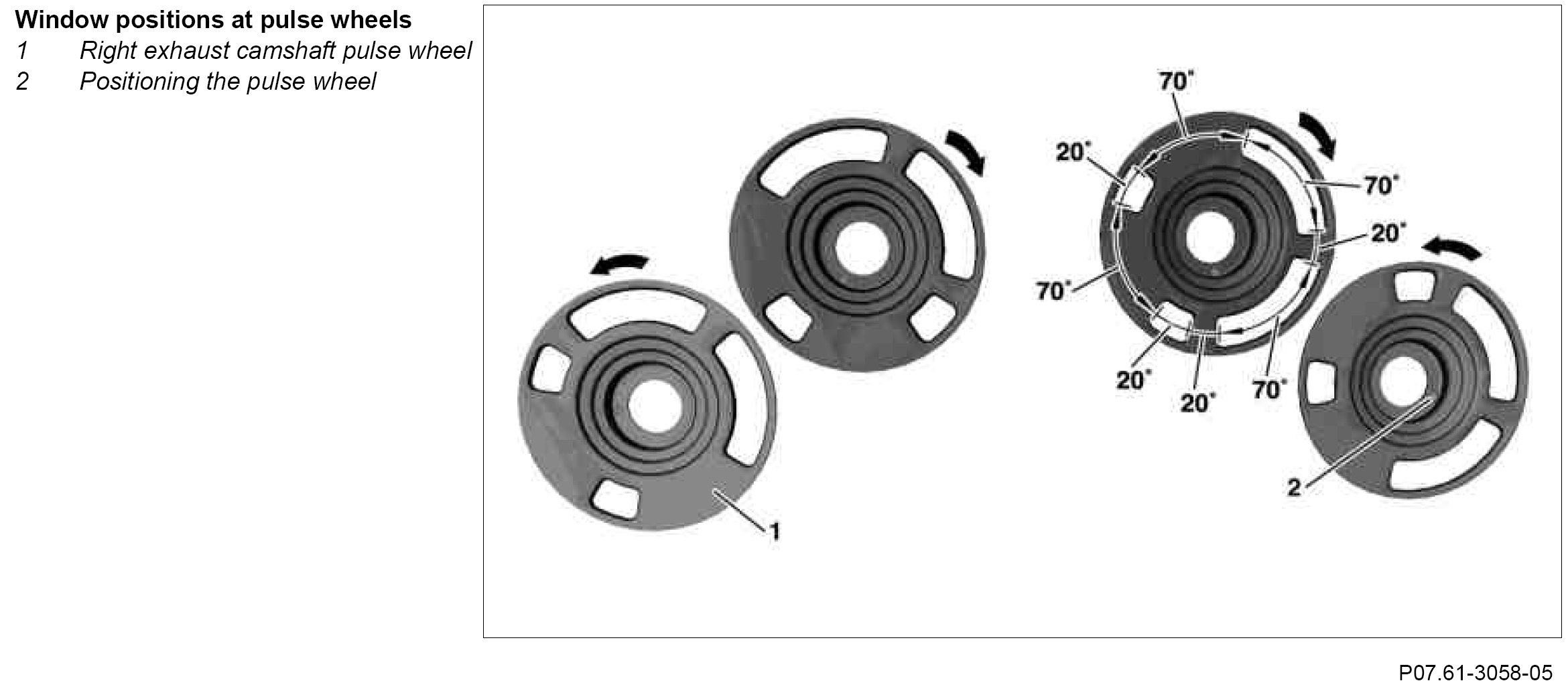 The camshaft positions are detected by the camshaft Hall sensor, which detects the position of the pulse wheels at the front on the camshafts. The camshaft position can already be detected when the engine is stationary by the electronics for the Hall sensor. This results in an improvement in the exhaust levels because the optimal injected quantity of fuel can be assigned to each cylinder immediately when the engine is started (quick-start function).