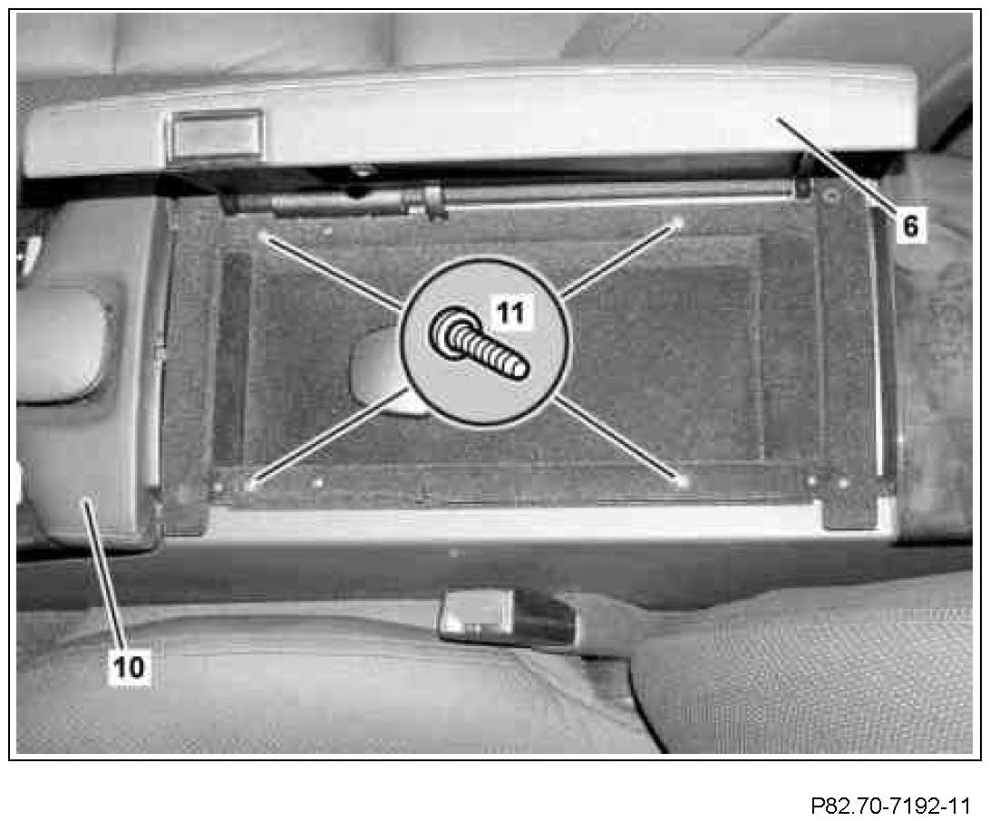 14 Position lid (6) above center console (10) and screw down using screws/bolts (11).