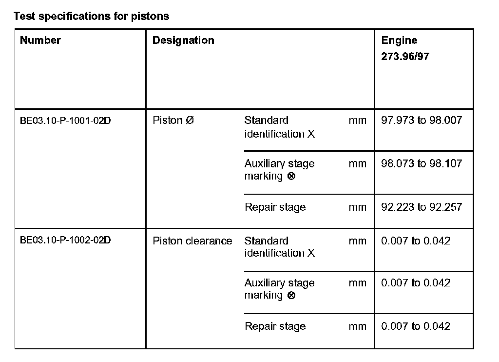 Test specifications for pistons: