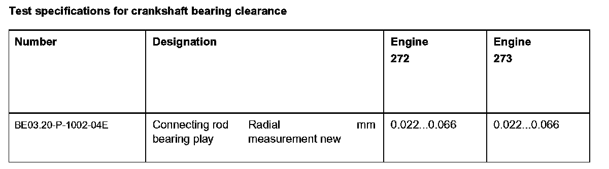 Test specifications for crankshaft bearing clearance: