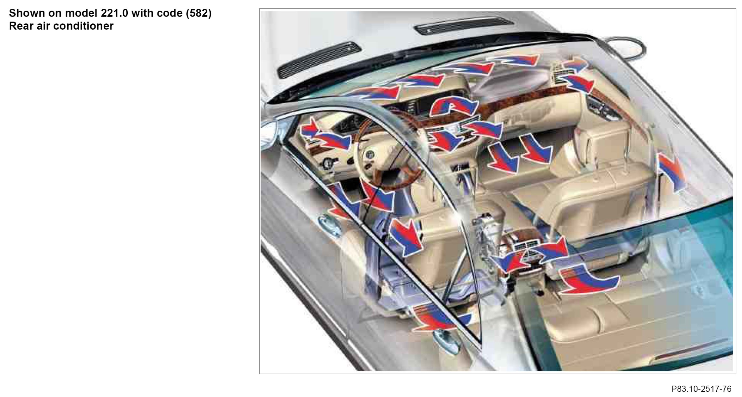 The ventilation system prevents windows from misting up, supplies air to the vehicle occupants, and ensures that uniform and pleasant temperatures in the vehicle interior are reached quickly. When the fresh air/air recirculation flap is adjusted correspondingly, fresh air is supplied to the air conditioner housing via the air inlet. Depending on the current settings at the upper control panel control unit (N72/1), at the front central operating unit (A40/9) or at the rear air conditioning control unit (N22/4) (model 221 with code (582) Rear air conditioning), the air is routed through air ducts and air outlets into the vehicle interior.