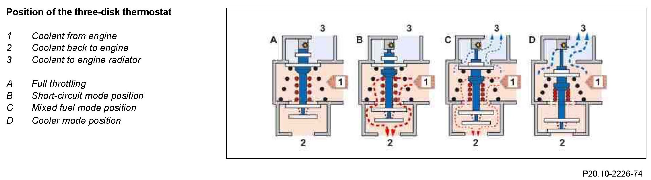 For mixed-fuel operation the three-disk thermostat is heated in such a way that the coolant flows through the engine radiator and the engine circuit.