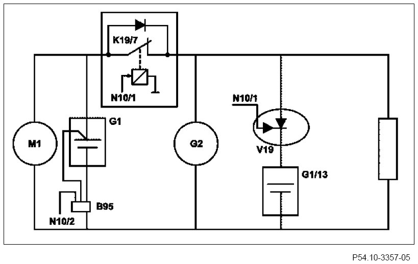 The front SAM control unit then actuates the on-board electrical system disconnect relay and the ECO start/stop function diode. The decoupling relay for the on-board electrical system connects the on-board electrical system battery to the on-board electrical system. The ECO start/stop function diode disconnects the ECO start/stop function additional battery from the on-board electrical system. The energy requirement of the on-board electrical system is now covered solely again by the on-board electrical system battery.