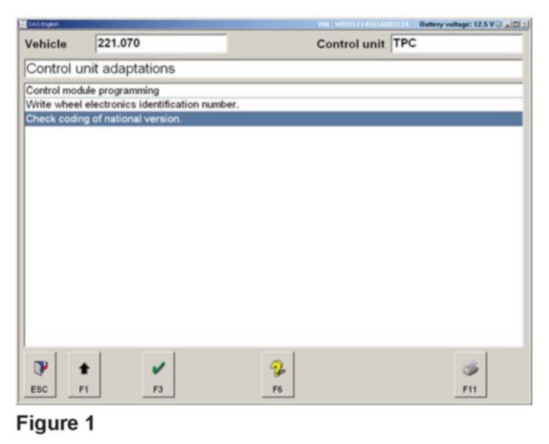 2. Check variant coding in TPM (RDK) control module: Control units/Chassis RDK tire pressure control/Control unit adaptations/new menu item Check coding of national version.