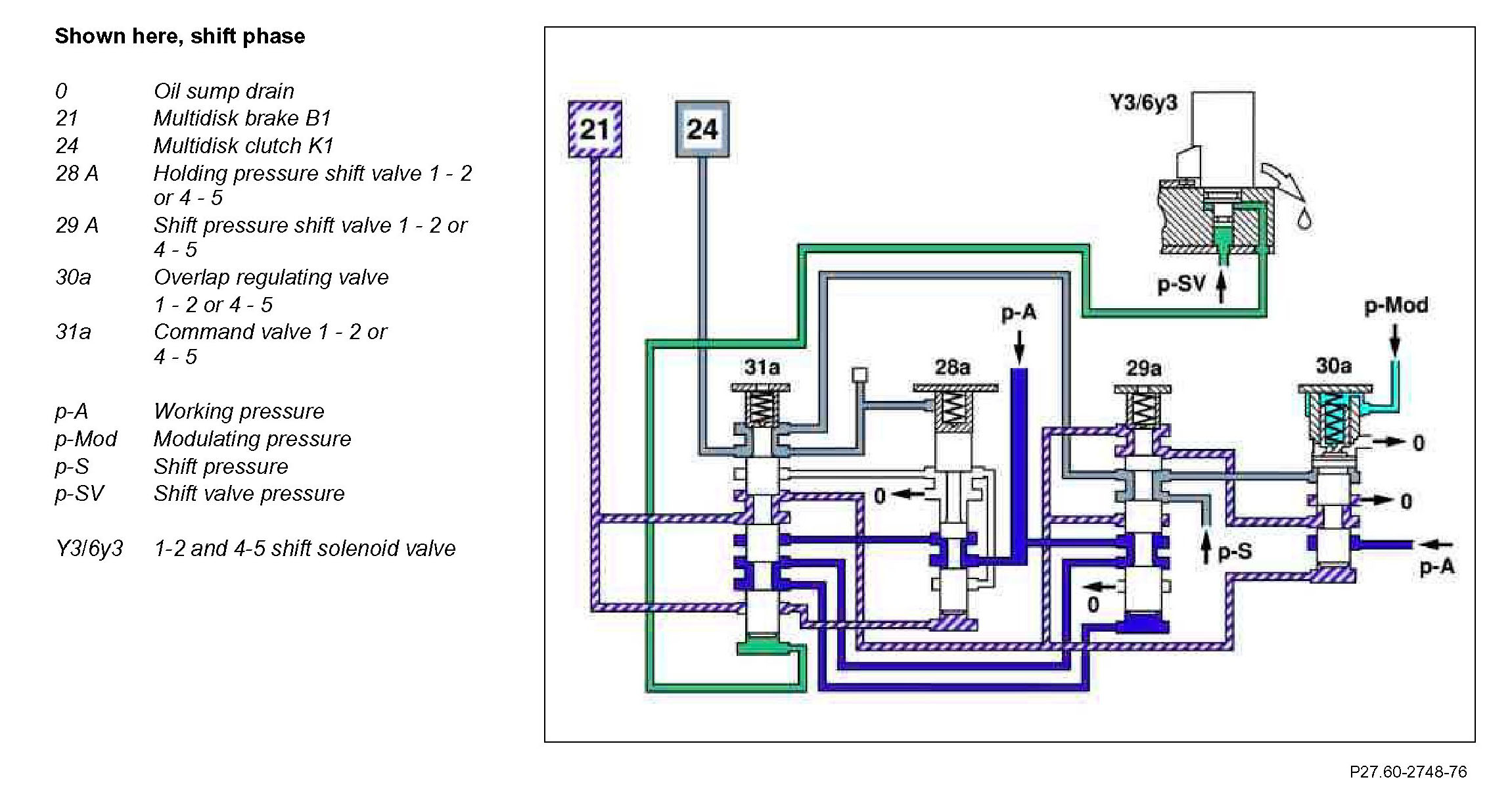 The multi-disk brake B1 (21) is disengaged (unpressurized). The spring in shift pressure shift valve 1 - 2 or 4 - 5 (29a) pushes this to its basic position.