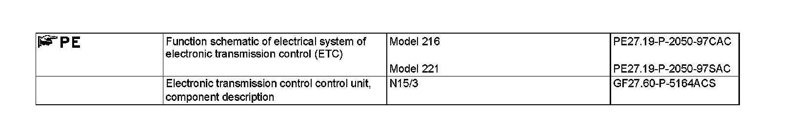 The kick down function is activated as of a pedal travel greater than 90 %. The "kick down" signal is transferred to the ETC [EGS] control unit by the CDI control unit (N3/9) or ME-SFI [ME] control unit (N3/10) via the drive train CAN. Based on this information the ETC [EGS] control unit actuates the control solenoid valve so that the upshifts and downshifts take place at increased engine speed in order to achieve maximum performance.