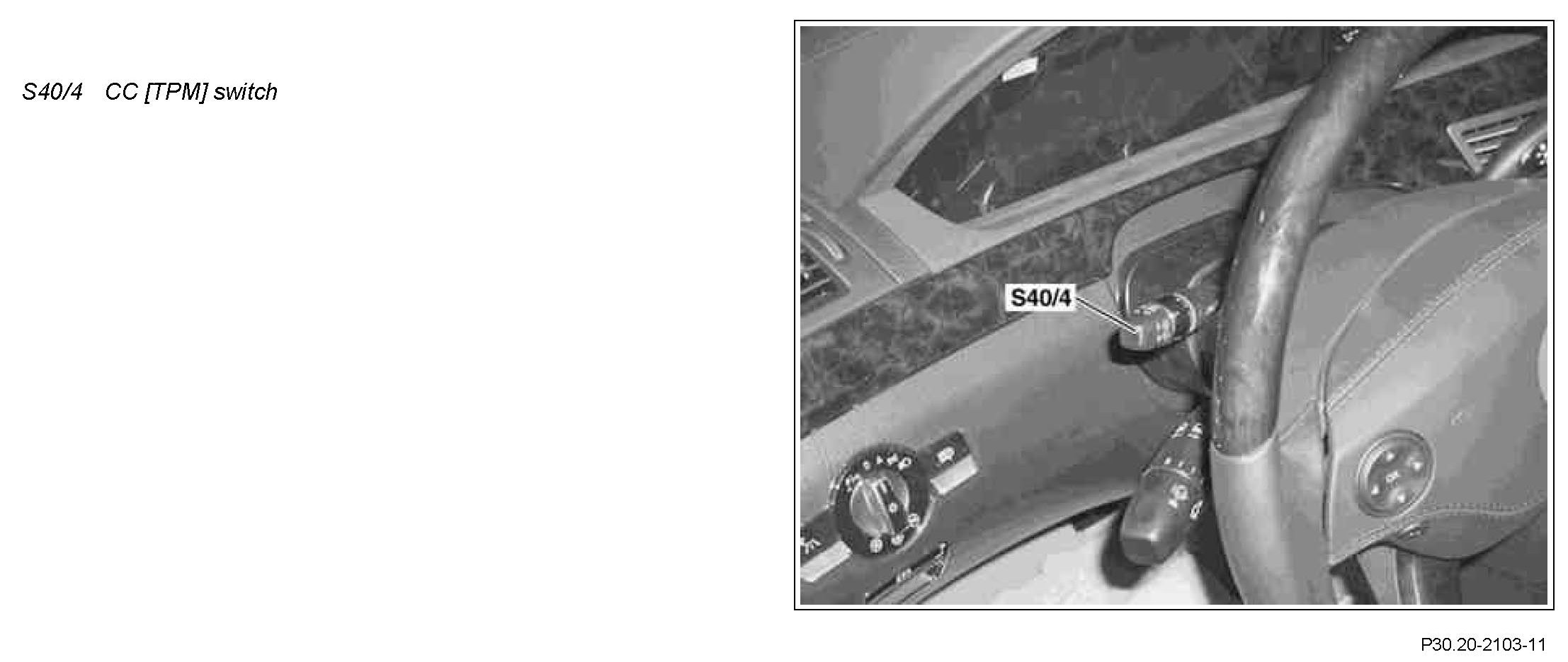 The CC [TPM] switch is located at the top left of the steering column module (N80).