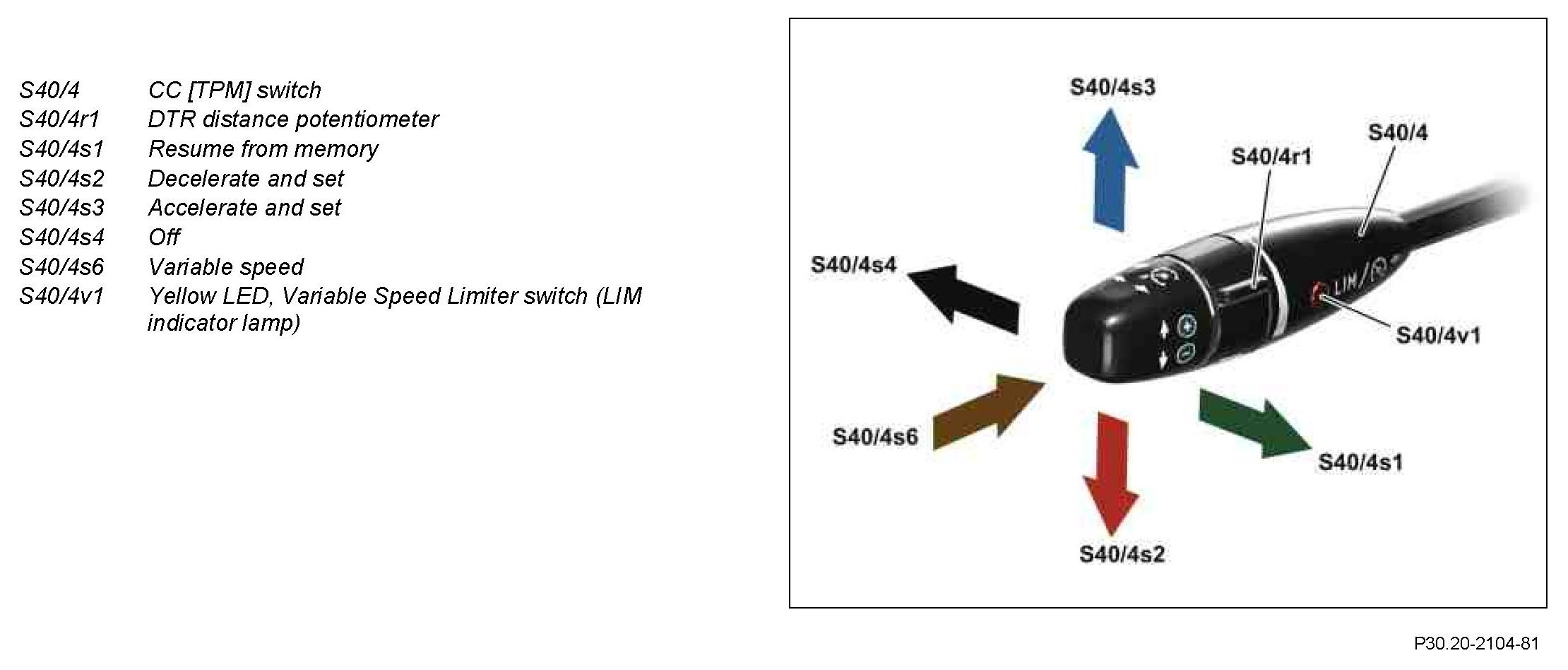 When the Cruise control pushbutton switch is operated, two switching contacts are always activated simultaneously. The actual input takes place by closing the switching contacts (storing the target speed). The safety contact must close simultaneously so that the input is accepted.