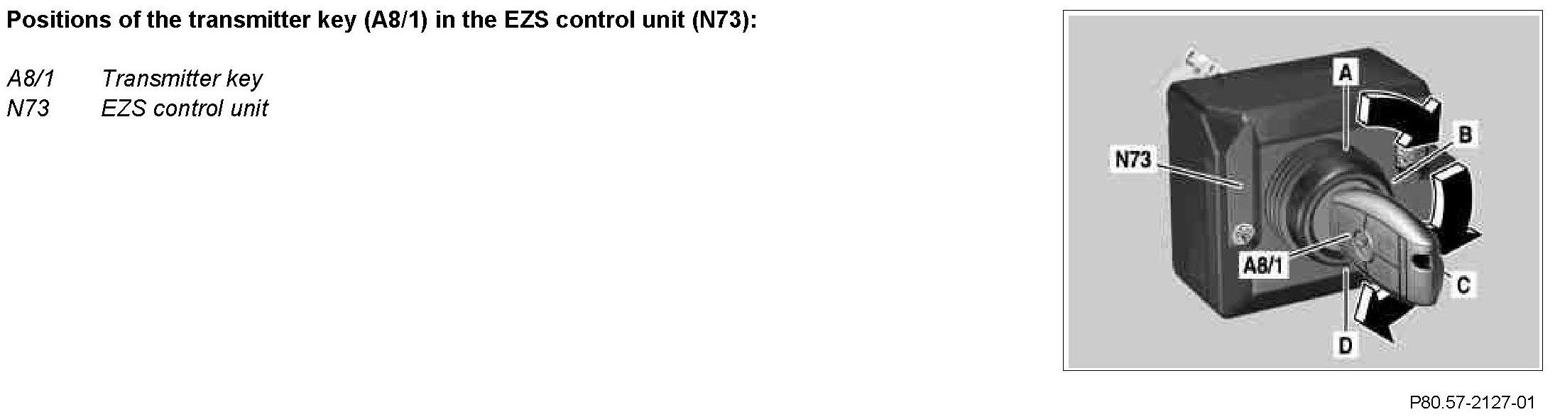 When the transmitter key is inserted into the EZS control unit, it switches on the inductive power transmission for power supply to the transmitter key. Encrypted data is exchanged via infrared signals between the transmitter key and the EZS control unit for identification.